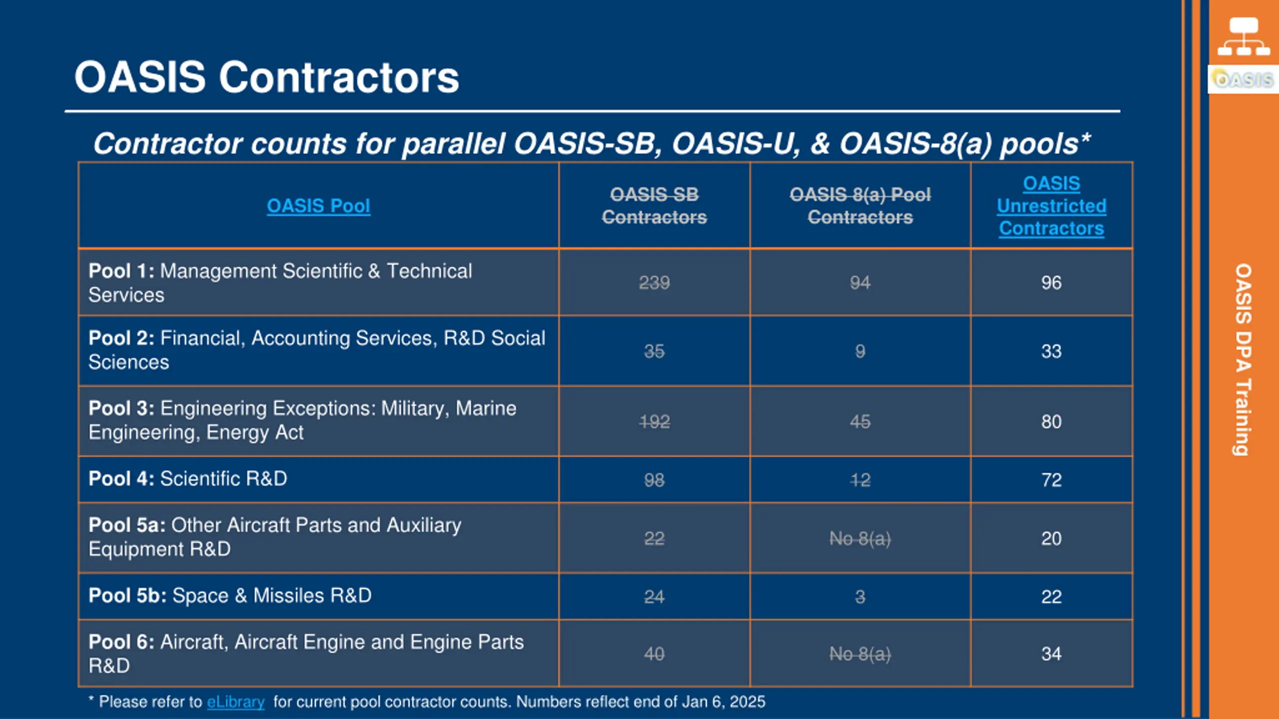 OASIS Contractors Contractor counts for parallel OASIS-SB, OASIS-U, & OASIS-8(a) pools* OASIS Unrestricted Contractors OASIS SB Contractors OASIS 8(a) Pool Contractors OASIS Pool Pool 1: Management Scientific & Technical Services OASIS DPA Training 239 94 96 Pool 2: Financial, Accounting Services, R&D Social Sciences 35 9 33 Pool 3: Engineering Exceptions: Military, Marine Engineering, Energy Act 192 45 80 Pool 4: Scientific R&D 98 12 72 Pool 5a: Other Aircraft Parts and Auxiliary Equipment R&D 22 No 8(a) 20 Pool 5b: Space & Missiles R&D 24 3 22 Pool 6: Aircraft, Aircraft Engine and Engine Parts R&D 40 No 8(a) 34 * Please refer to eLibrary for current pool contractor counts. Numbers reflect end of Jan 6, 2025