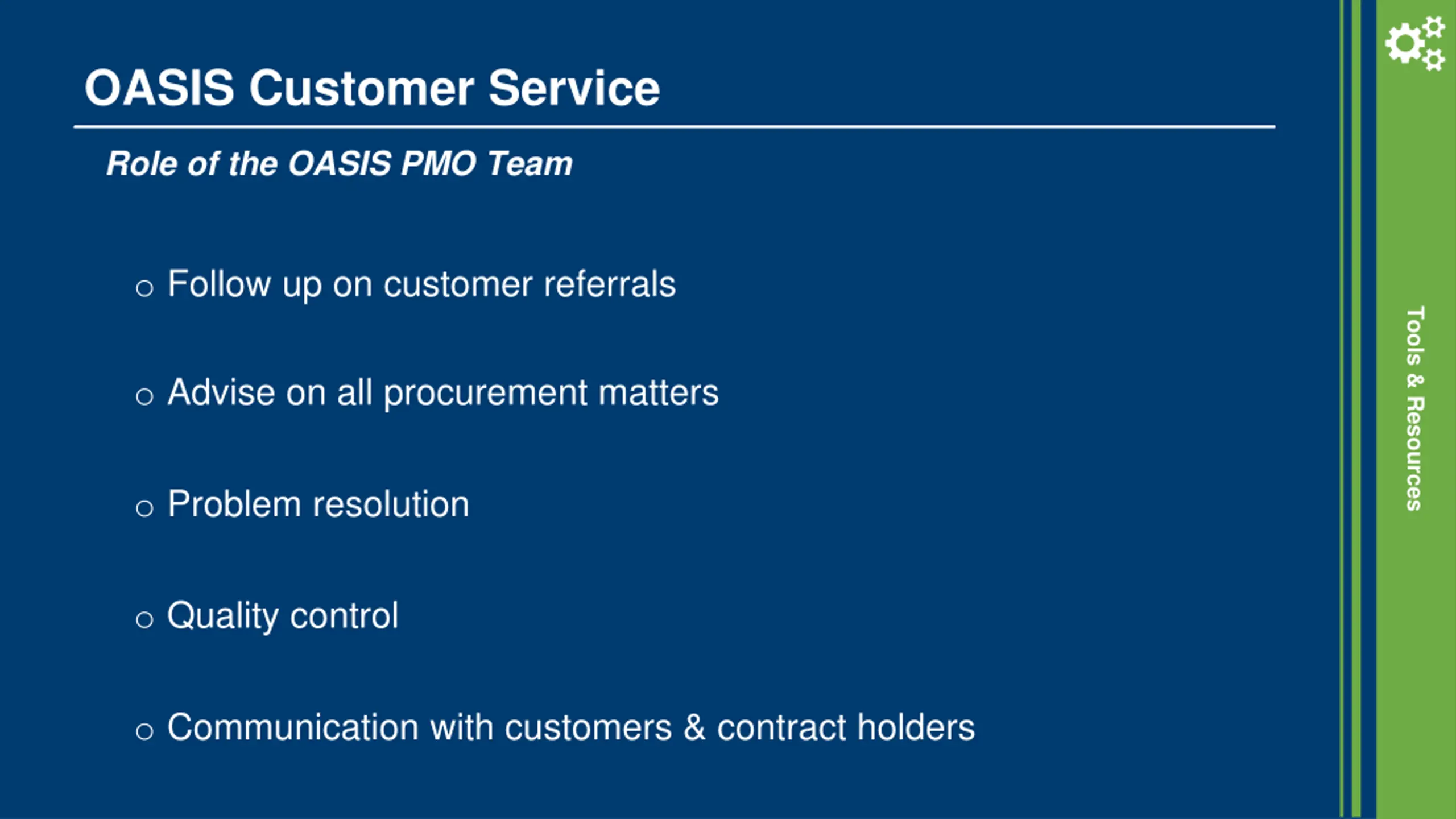 OASIS Customer Service Role of the OASIS PMO Team o Follow up on customer referrals Tools & Resources o Advise on all procurement matters o Problem resolution o Quality control o Communication with customers & contract holders