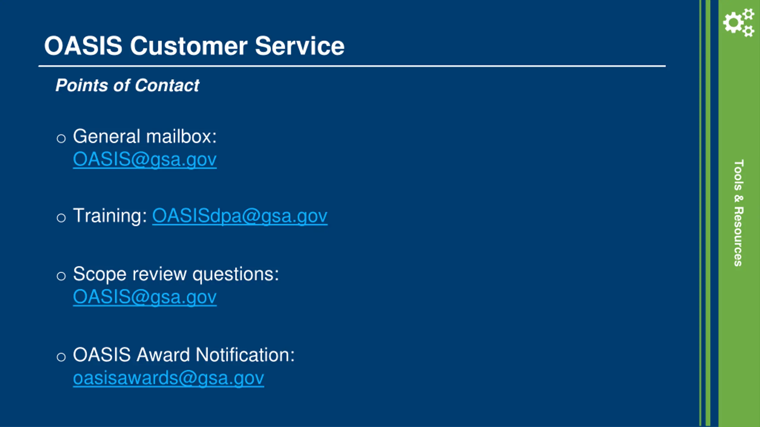 OASIS Customer Service Points of Contact o General mailbox: OASIS@gsa.gov Tools & Resources o Training: OASISdpa@gsa.gov o Scope review questions: OASIS@gsa.gov o OASIS Award Notification: oasisawards@gsa.gov