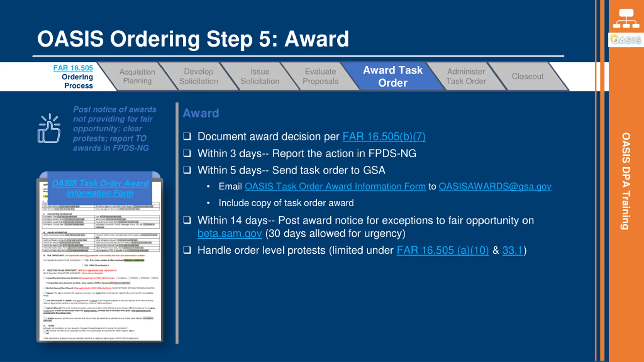 OASIS Ordering Step 5: Award FAR 16.505 Ordering Process Award Task Order Develop Solicitation Issue Solicitation Evaluate Proposals Administer Task Order Acquisition Planning Closeout Post notice of awards not providing for fair opportunity; clear protests; report TO awards in FPDS-NG Award Document award decision per FAR 16.505(b)(7) Within 3 days-- Report the action in FPDS-NG Within 5 days-- Send task order to GSA Email OASIS Task Order Award Information Form to OASISAWARDS@gsa.gov OASIS DPA Training OASIS Task Order Award Information Form Include copy of task order award Within 14 days-- Post award notice for exceptions to fair opportunity on beta.sam.gov (30 days allowed for urgency) Handle order level protests (limited under FAR 16.505 (a)(10) & 33.1)