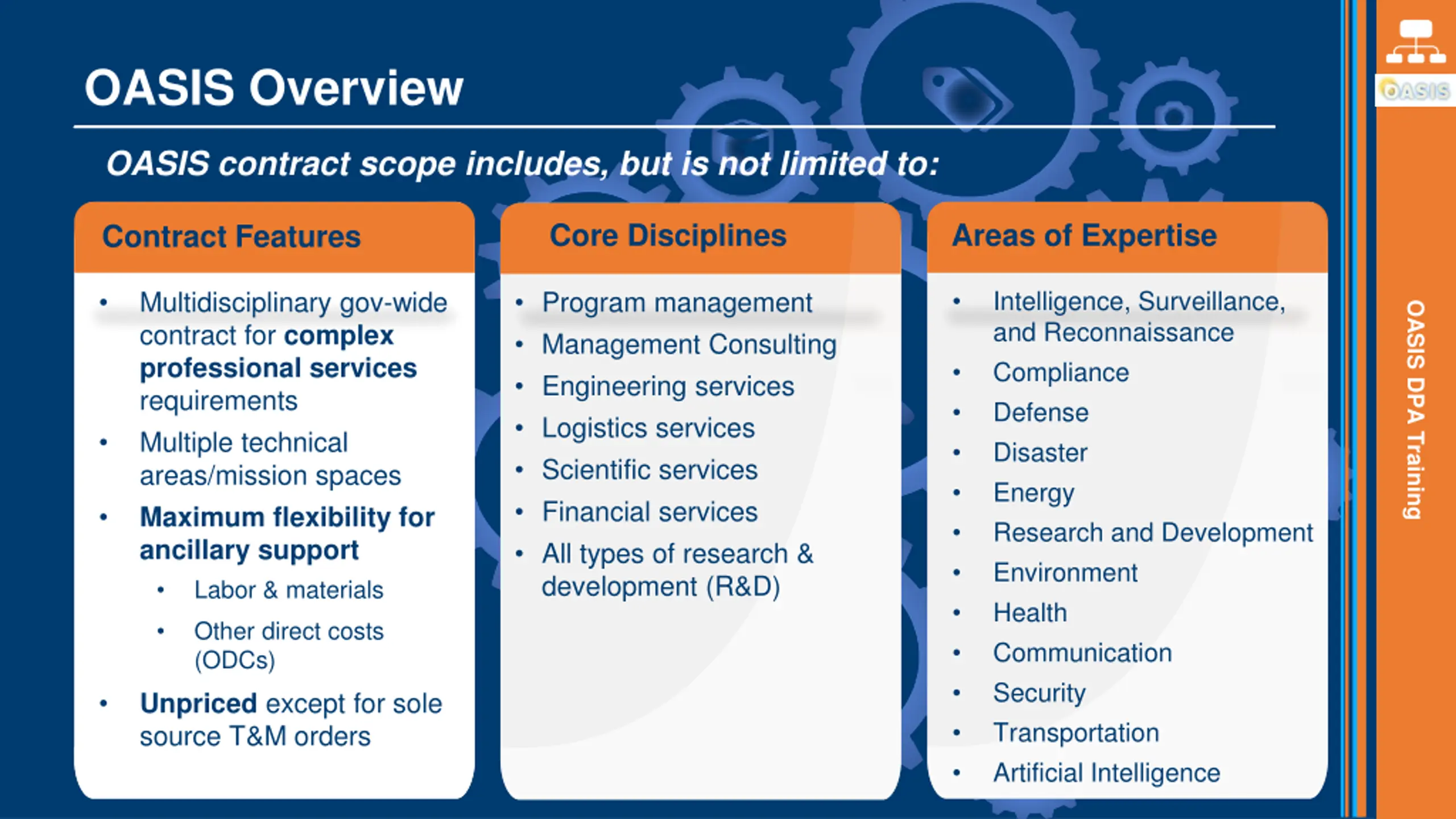 OASIS Overview OASIS contract scope includes, but is not limited to: Core Disciplines Areas of Expertise Contract Features Intelligence, Surveillance, and Reconnaissance Compliance Defense Disaster Energy Research and Development Environment Health Communication Security Transportation Artificial Intelligence Multidisciplinary gov-wide contract for complex professional services requirements Multiple technical areas/mission spaces Maximum flexibility for ancillary support Labor & materials Program management Management Consulting Engineering services Logistics services Scientific services Financial services All types of research & development (R&D) HCaTS DPA Training OASIS DPA Training Other direct costs (ODCs) Unpriced except for sole source T&M orders