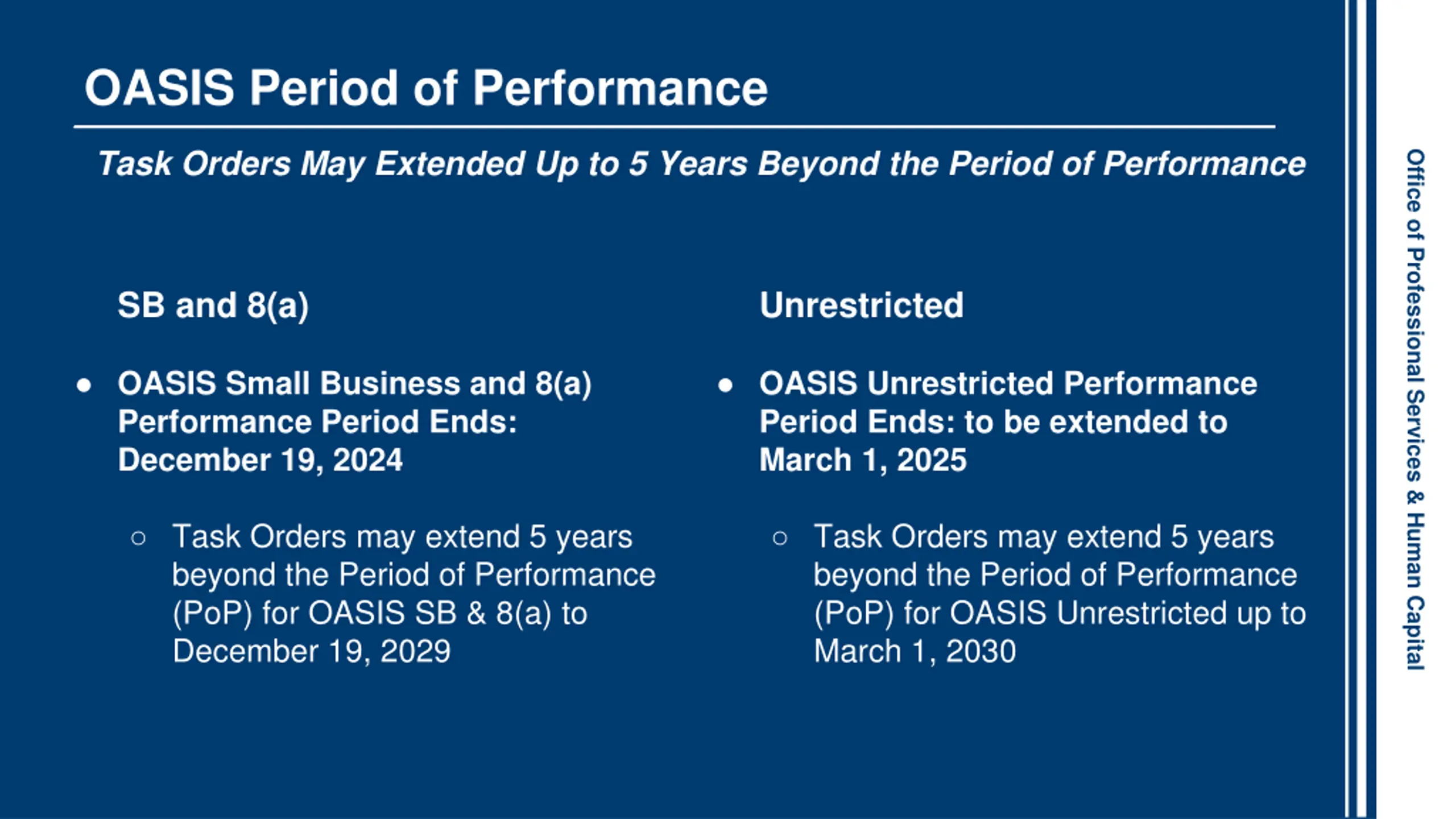 OASIS Period of Performance Task Orders May Extended Up to 5 Years Beyond the Period of Performance Office of Professional Services & Human Capital SB and 8(a) Unrestricted OASIS Small Business and 8(a) Performance Period Ends: December 19, 2024 OASIS Unrestricted Performance Period Ends: to be extended to March 1, 2025 Task Orders may extend 5 years beyond the Period of Performance (PoP) for OASIS SB & 8(a) to December 19, 2029 Task Orders may extend 5 years beyond the Period of Performance (PoP) for OASIS Unrestricted up to March 1, 2030