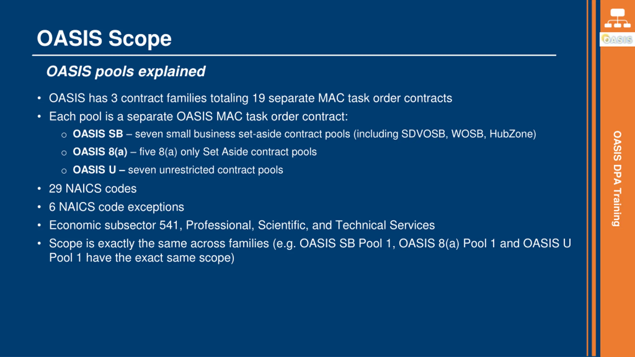 OASIS Scope OASIS pools explained OASIS has 3 contract families totaling 19 separate MAC task order contracts Each pool is a separate OASIS MAC task order contract: o OASIS SB seven small business set-aside contract pools (including SDVOSB, WOSB, HubZone) o OASIS 8(a) five 8(a) only Set Aside contract pools o OASIS U seven unrestricted contract pools 29 NAICS codes 6 NAICS code exceptions Economic subsector 541, Professional, Scientific, and Technical Services Scope is exactly the same across families (e.g. OASIS SB Pool 1, OASIS 8(a) Pool 1 and OASIS U Pool 1 have the exact same scope) OASIS DPA Training