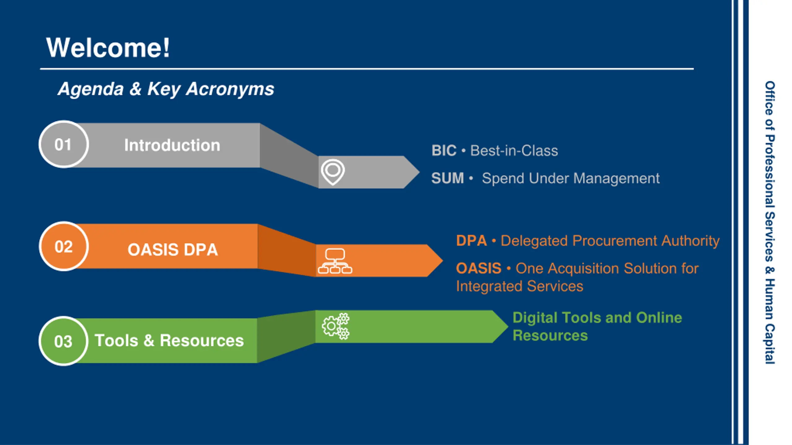 Welcome! Agenda & Key Acronyms Office of Professional Services & Human Capital 01 Introduction BIC Best-in-Class SUM Spend Under Management DPA Delegated Procurement Authority 02 OASIS DPA OASIS One Acquisition Solution for Integrated Services Digital Tools and Online Resources Tools & Resources 03