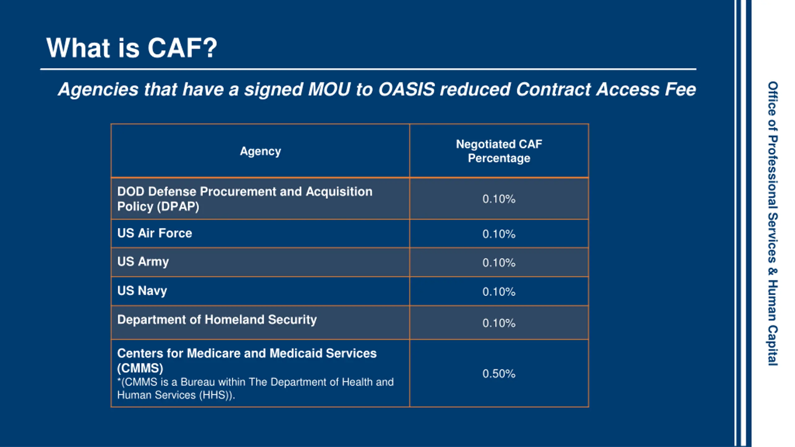 What is CAF? Agencies that have a signed MOU to OASIS reduced Contract Access Fee Office of Professional Services & Human Capital Negotiated CAF Percentage Agency DOD Defense Procurement and Acquisition Policy (DPAP) 0.10% US Air Force 0.10% US Army 0.10% US Navy 0.10% Department of Homeland Security 0.10% Centers for Medicare and Medicaid Services (CMMS) *(CMMS is a Bureau within The Department of Health and Human Services (HHS)). 0.50%