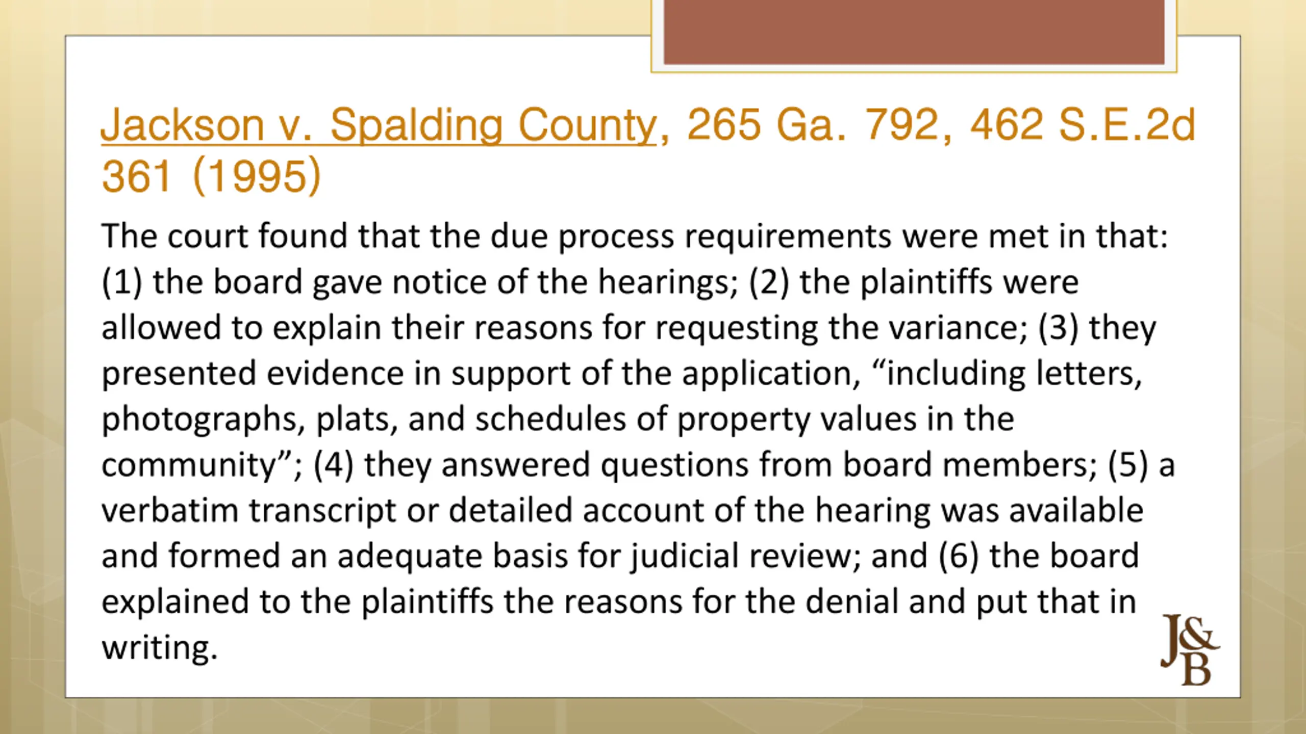 Jackson Jackson v. Spalding County v. Spalding County, 265 Ga. 792, 462 S.E.2d 361 (1995 361 (1995) ) , 265 Ga. 792, 462 S.E.2d The court found that the due process requirements were met in that: (1) the board gave notice of the hearings; (2) the plaintiffs were allowed to explain their reasons for requesting the variance; (3) they presented evidence in support of the application, including letters, photographs, plats, and schedules of property values in the community ; (4) they answered questions from board members; (5) a verbatim transcript or detailed account of the hearing was available and formed an adequate basis for judicial review; and (6) the board explained to the plaintiffs the reasons for the denial and put that in writing.
