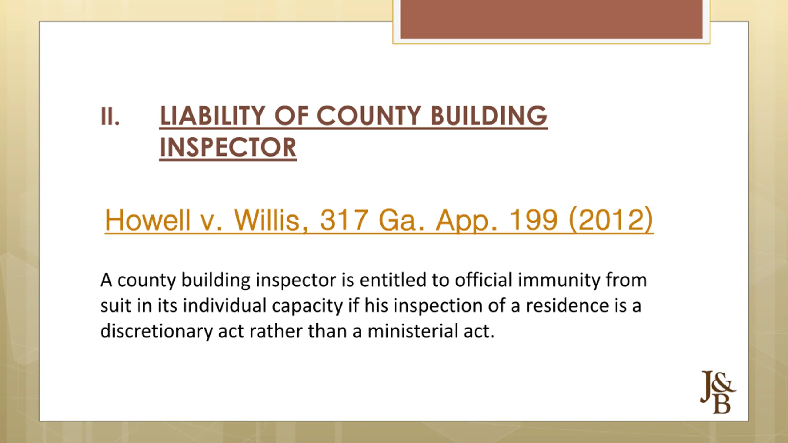LIABILITY OF COUNTY BUILDING INSPECTOR II. Howell v. Willis, 317 Ga. App. 199 (2012 Howell v. Willis, 317 Ga. App. 199 (2012) ) A county building inspector is entitled to official immunity from suit in its individual capacity if his inspection of a residence is a discretionary act rather than a ministerial act.