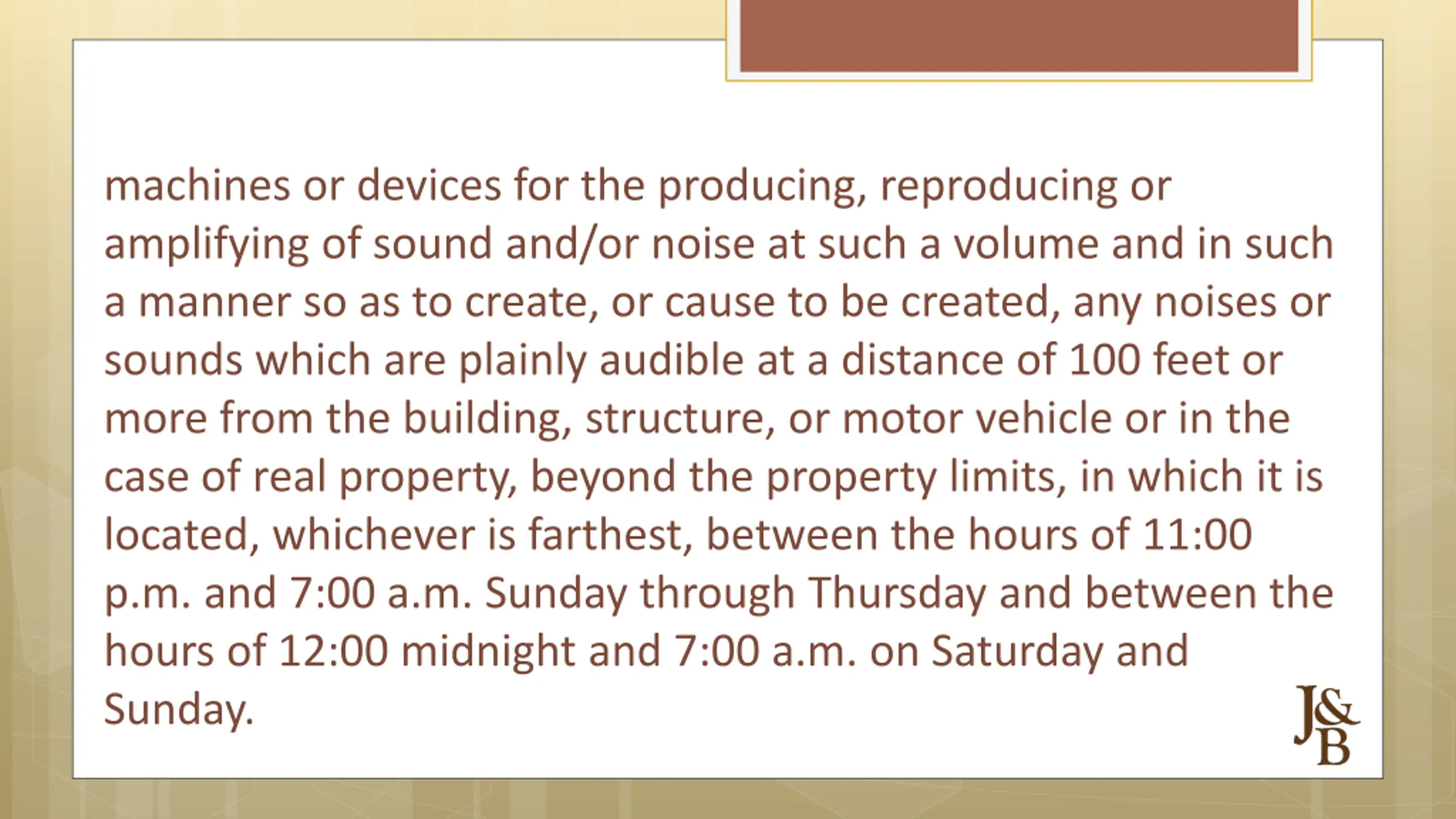 machines or devices for the producing, reproducing or amplifying of sound and/or noise at such a volume and in such a manner so as to create, or cause to be created, any noises or sounds which are plainly audible at a distance of 100 feet or more from the building, structure, or motor vehicle or in the case of real property, beyond the property limits, in which it is located, whichever is farthest, between the hours of 11:00 p.m. and 7:00 a.m. Sunday through Thursday and between the hours of 12:00 midnight and 7:00 a.m. on Saturday and Sunday.