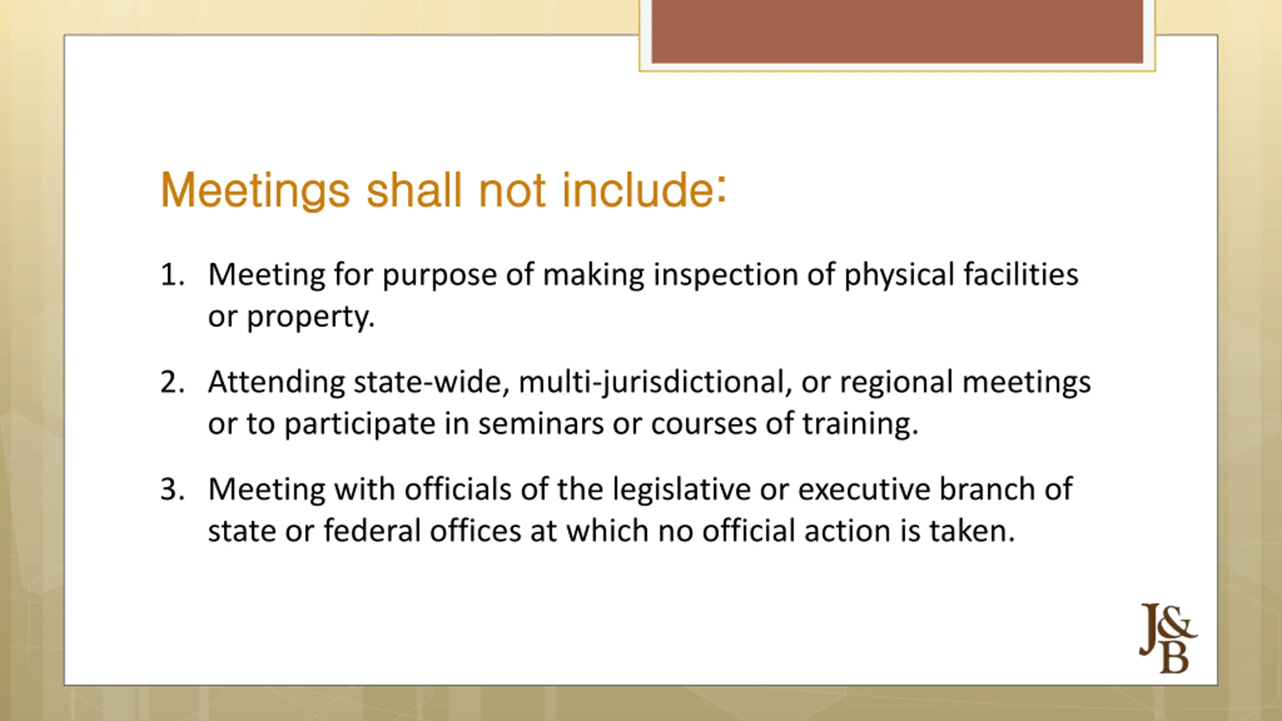 Meetings shall not include: Meetings shall not include: 1. Meeting for purpose of making inspection of physical facilities or property. 2. Attending state-wide, multi-jurisdictional, or regional meetings or to participate in seminars or courses of training. 3. Meeting with officials of the legislative or executive branch of state or federal offices at which no official action is taken.