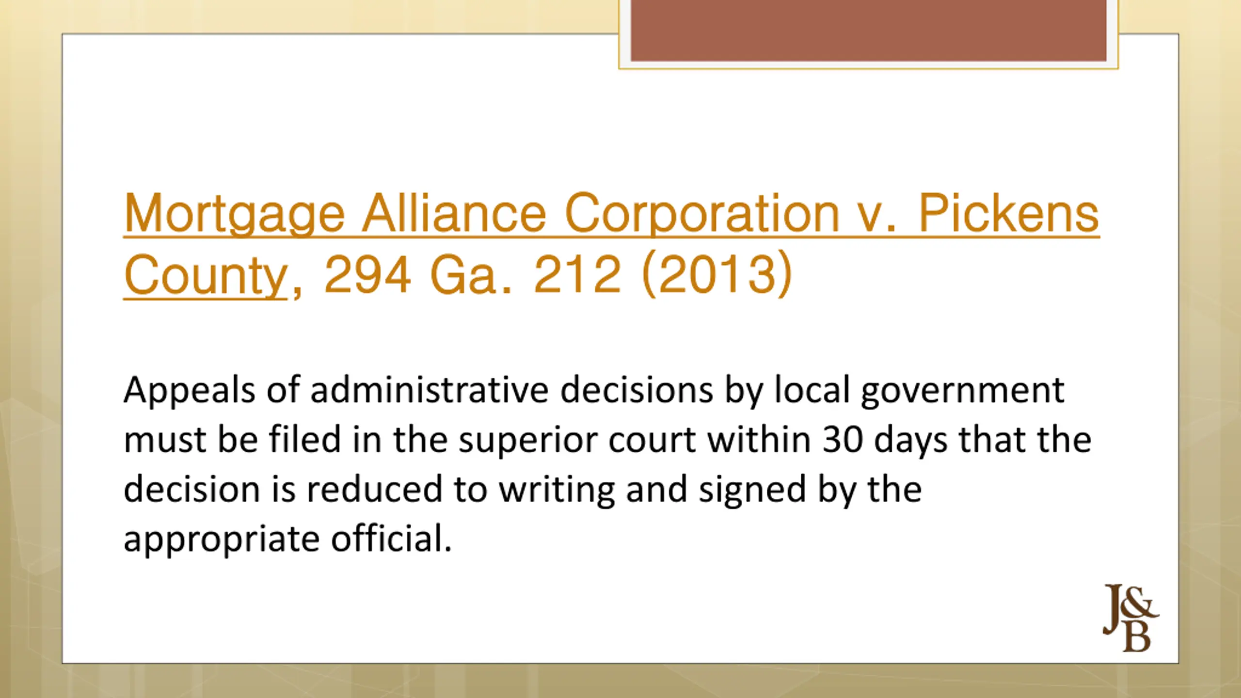 Mortgage Alliance Corporation v. Pickens Mortgage Alliance Corporation v. Pickens County County, 294 Ga. 212 (2013 , 294 Ga. 212 (2013) ) Appeals of administrative decisions by local government must be filed in the superior court within 30 days that the decision is reduced to writing and signed by the appropriate official.