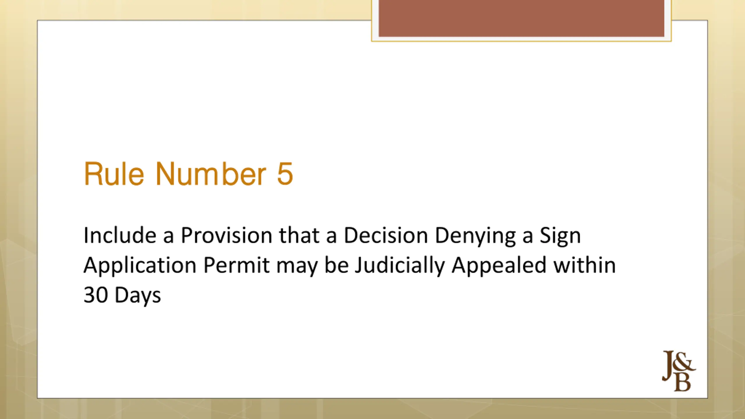 Rule Number Rule Number 5 5 Include a Provision that a Decision Denying a Sign Application Permit may be Judicially Appealed within 30 Days