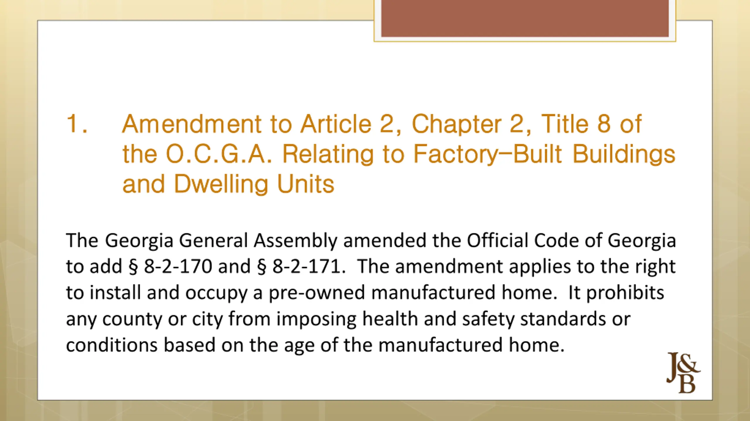 1. 1. Amendment to Article 2, Chapter Amendment to Article 2, Chapter 2 2, Title the the O.C.G.A. Relating O.C.G.A. Relating to and Dwelling and Dwelling Units Units , Title 8 of Built Buildings Buildings 8 of to Factory Factory- -Built TheGeorgia General Assembly amended the Official Code of Georgia to add 8-2-170 and 8-2-171. The amendment applies to the right to install and occupy a pre-owned manufactured home. It prohibits any county or city from imposing health and safety standards or conditions based on the age of the manufactured home.