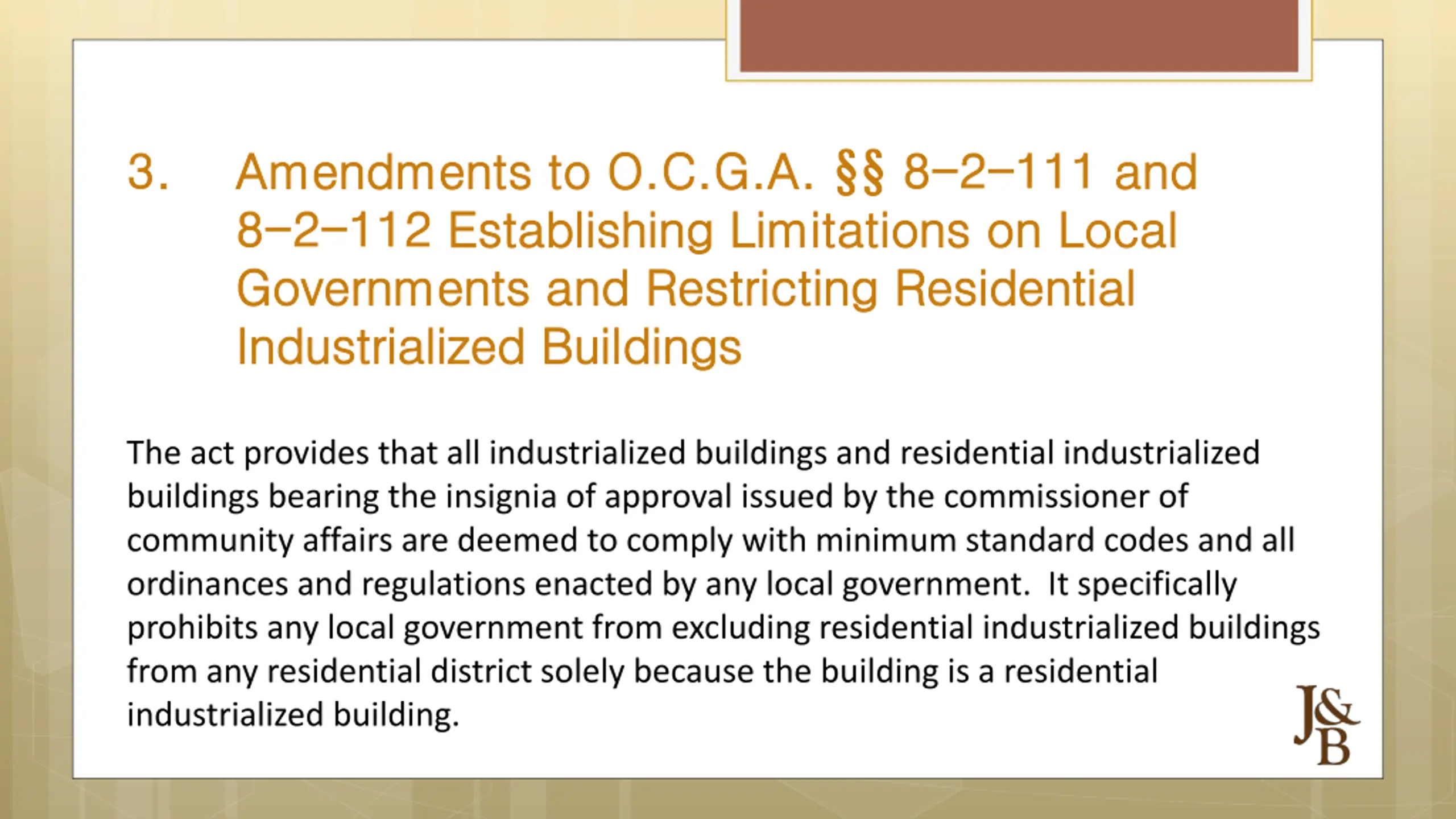 3. 3. Amendments Amendments to O.C.G.A. 8 8- -2 2- -112 112 Establishing Limitations on Local Establishing Limitations on Local Governments Governments and Restricting Residential and Restricting Residential Industrialized Industrialized Buildings Buildings to O.C.G.A. 8 8- -2 2- -111 and 111 and The act provides that all industrialized buildings and residential industrialized buildings bearing the insignia of approval issued by the commissioner of community affairs are deemed to comply with minimum standard codes and all ordinances and regulations enacted by any local government. It specifically prohibits any local government from excluding residential industrialized buildings from any residential district solely because the building is a residential industrialized building.