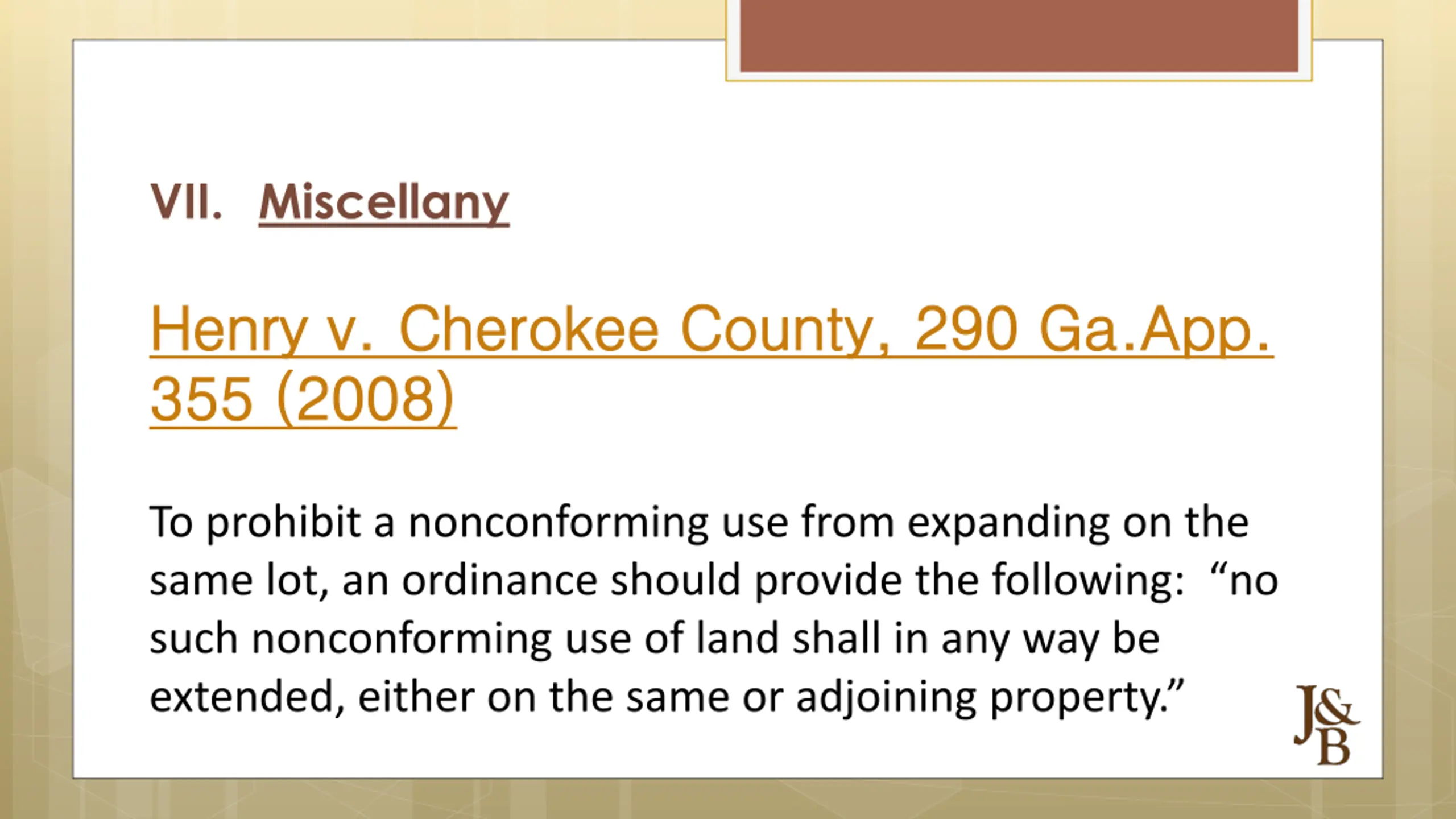 VII. Miscellany Henry v. Cherokee County, 290 Henry v. Cherokee County, 290 Ga.App 355 (2008) 355 (2008) Ga.App. . To prohibit a nonconforming use from expanding on the same lot, an ordinance should provide the following: no such nonconforming use of land shall in any way be extended, either on the same or adjoining property.