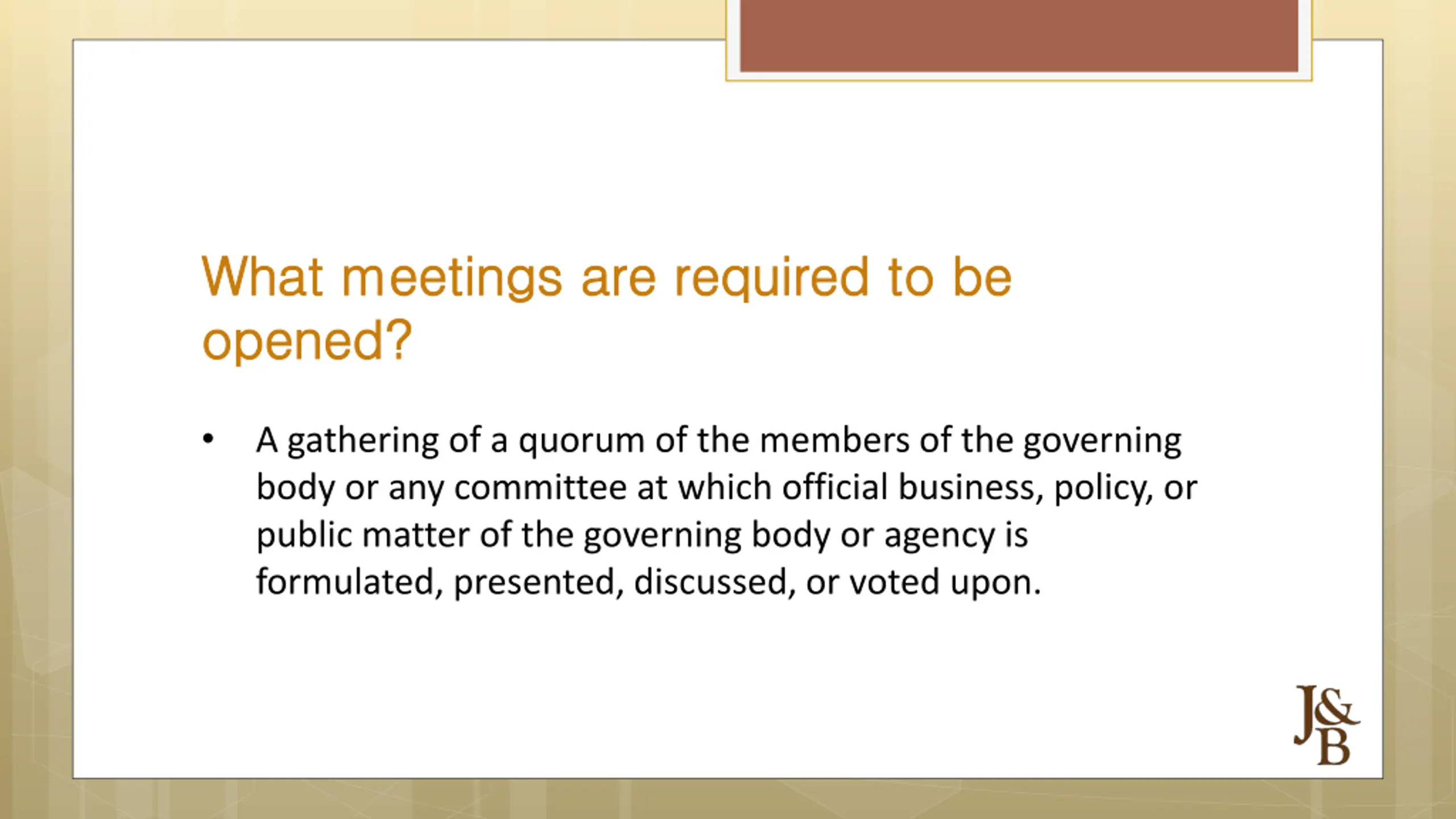What meetings are required to be What meetings are required to be opened opened? ? A gathering of a quorum of the members of the governing body or any committee at which official business, policy, or public matter of the governing body or agency is formulated, presented, discussed, or voted upon.