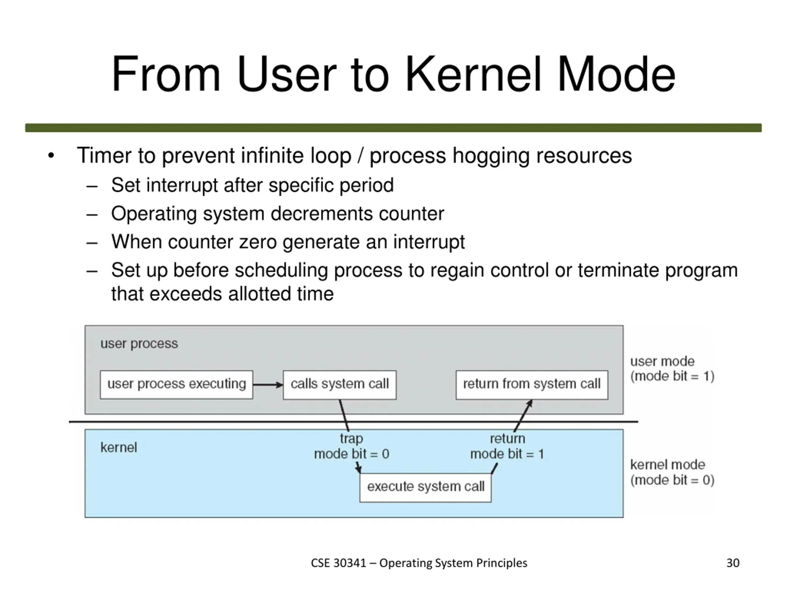 From User to Kernel Mode Timer to prevent infinite loop / process hogging resources Set interrupt after specific period Operating system decrements counter When counter zero generate an interrupt Set up before scheduling process to regain control or terminate program that exceeds allotted time CSE 30341 Operating System Principles 30