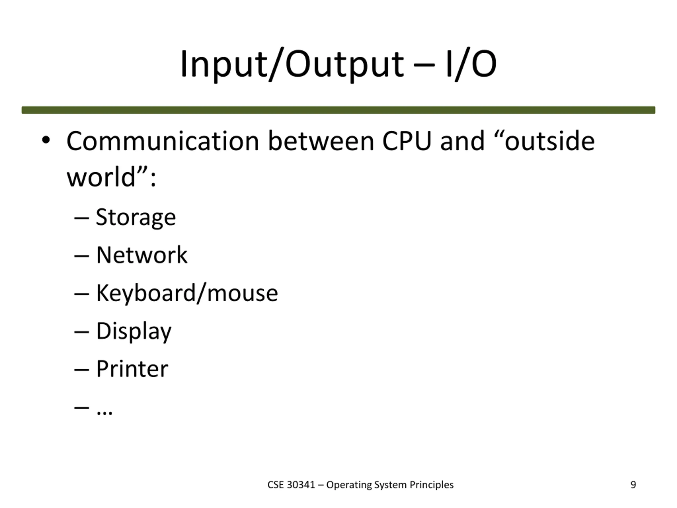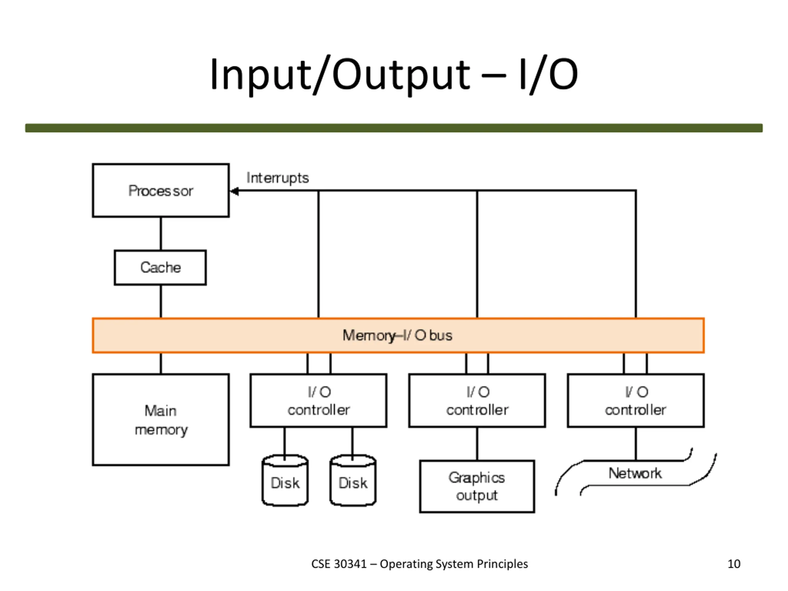Input/Output I/O Communication between CPU and outside world : Storage Network Keyboard/mouse Display Printer CSE 30341 Operating System Principles 9