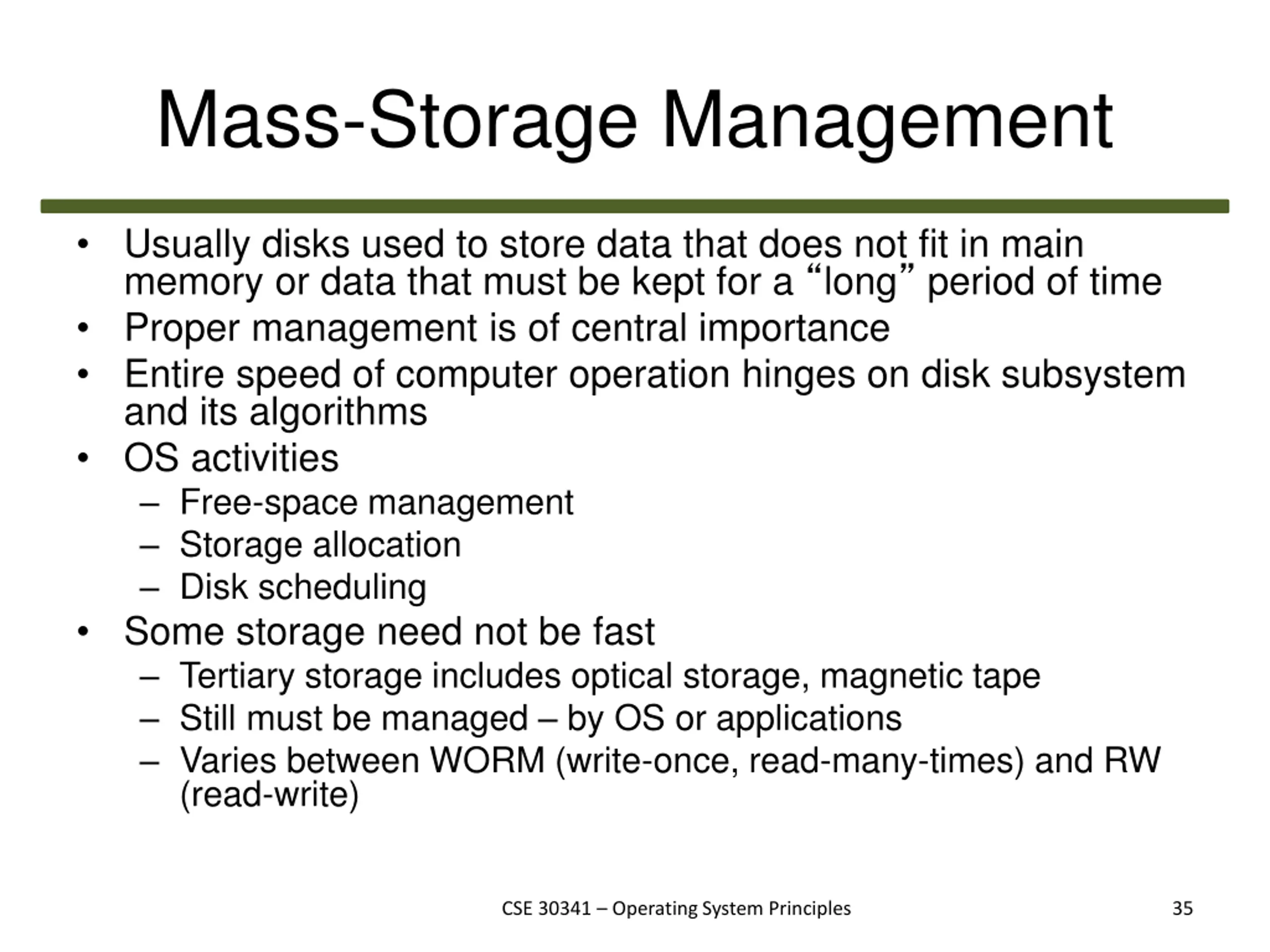Mass-Storage Management Usually disks used to store data that does not fit in main memory or data that must be kept for a long period of time Proper management is of central importance Entire speed of computer operation hinges on disk subsystem and its algorithms OS activities Free-space management Storage allocation Disk scheduling Some storage need not be fast Tertiary storage includes optical storage, magnetic tape Still must be managed by OS or applications Varies between WORM (write-once, read-many-times) and RW (read-write) CSE 30341 Operating System Principles 35