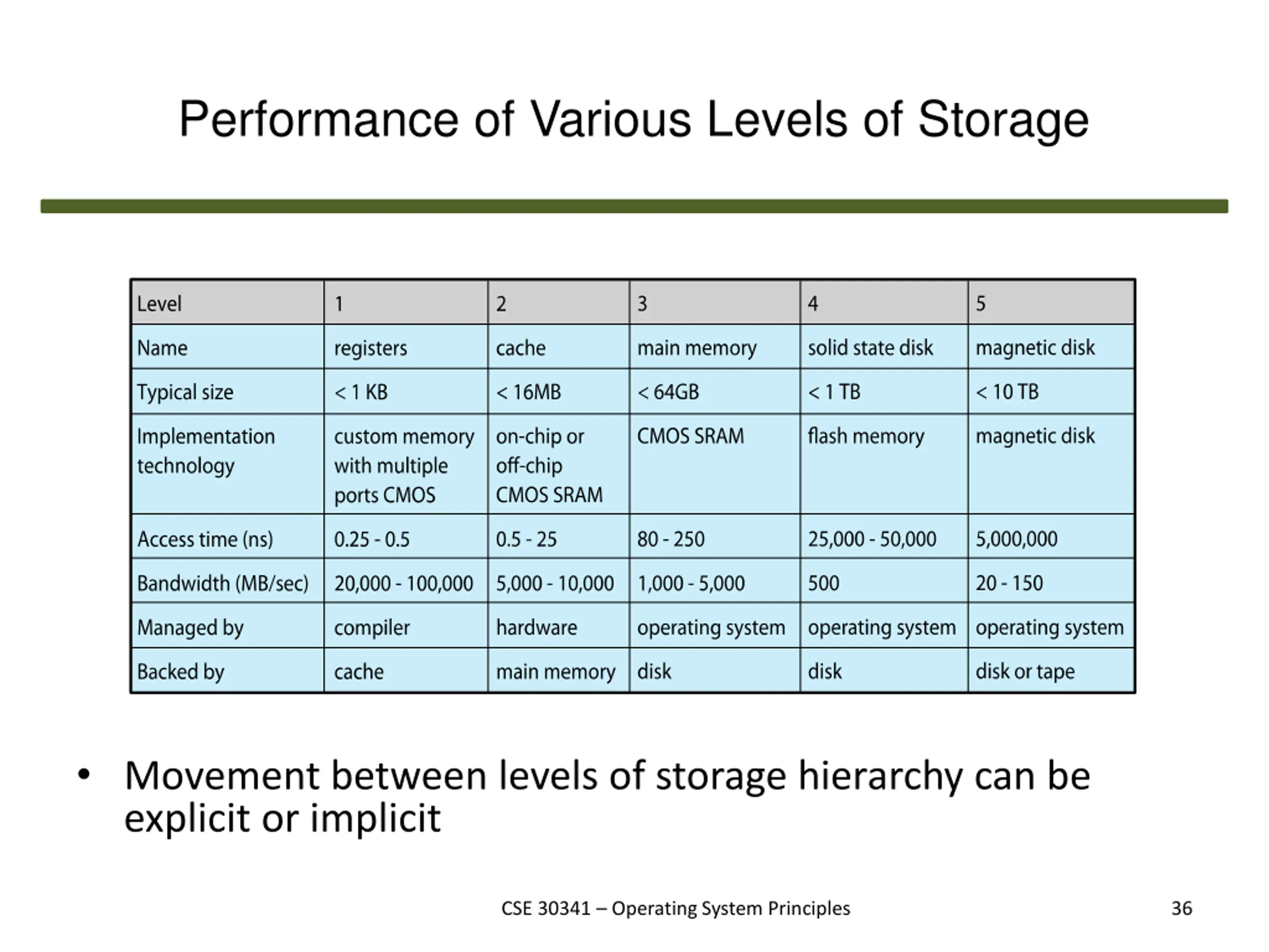 Performance of Various Levels of Storage Movement between levels of storage hierarchy can be explicit or implicit CSE 30341 Operating System Principles 36