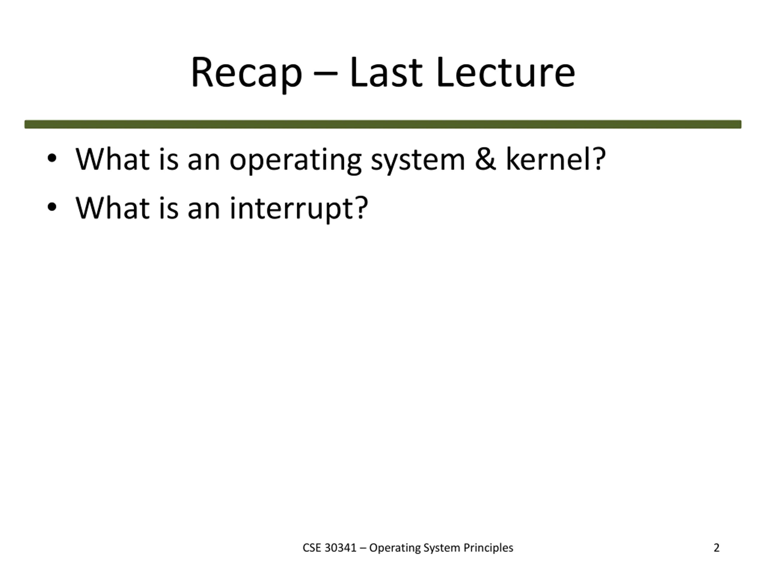 Recap Last Lecture What is an operating system & kernel? What is an interrupt? CSE 30341 Operating System Principles 2