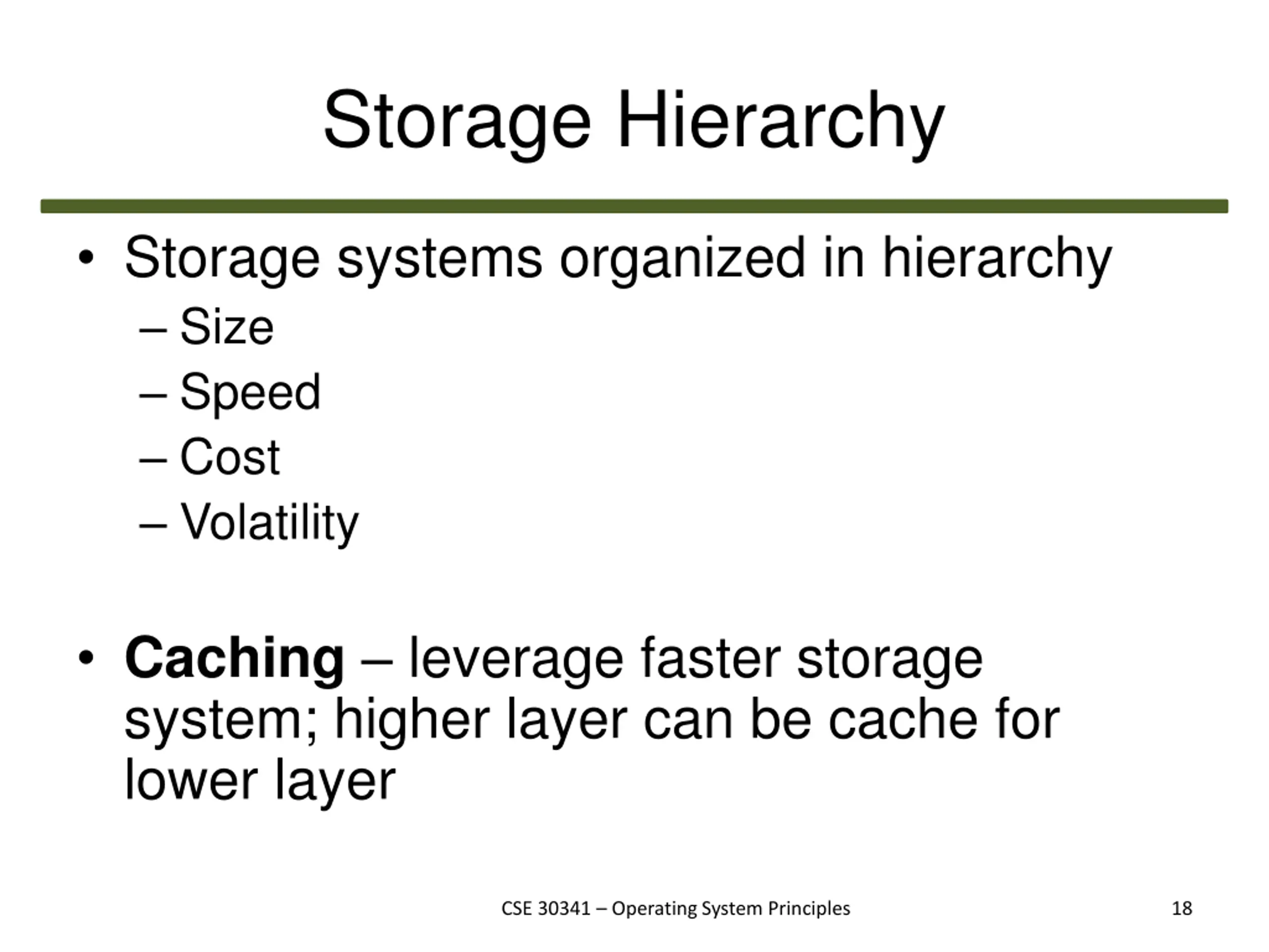 Storage Hierarchy Storage systems organized in hierarchy Size Speed Cost Volatility Caching leverage faster storage system; higher layer can be cache for lower layer CSE 30341 Operating System Principles 18