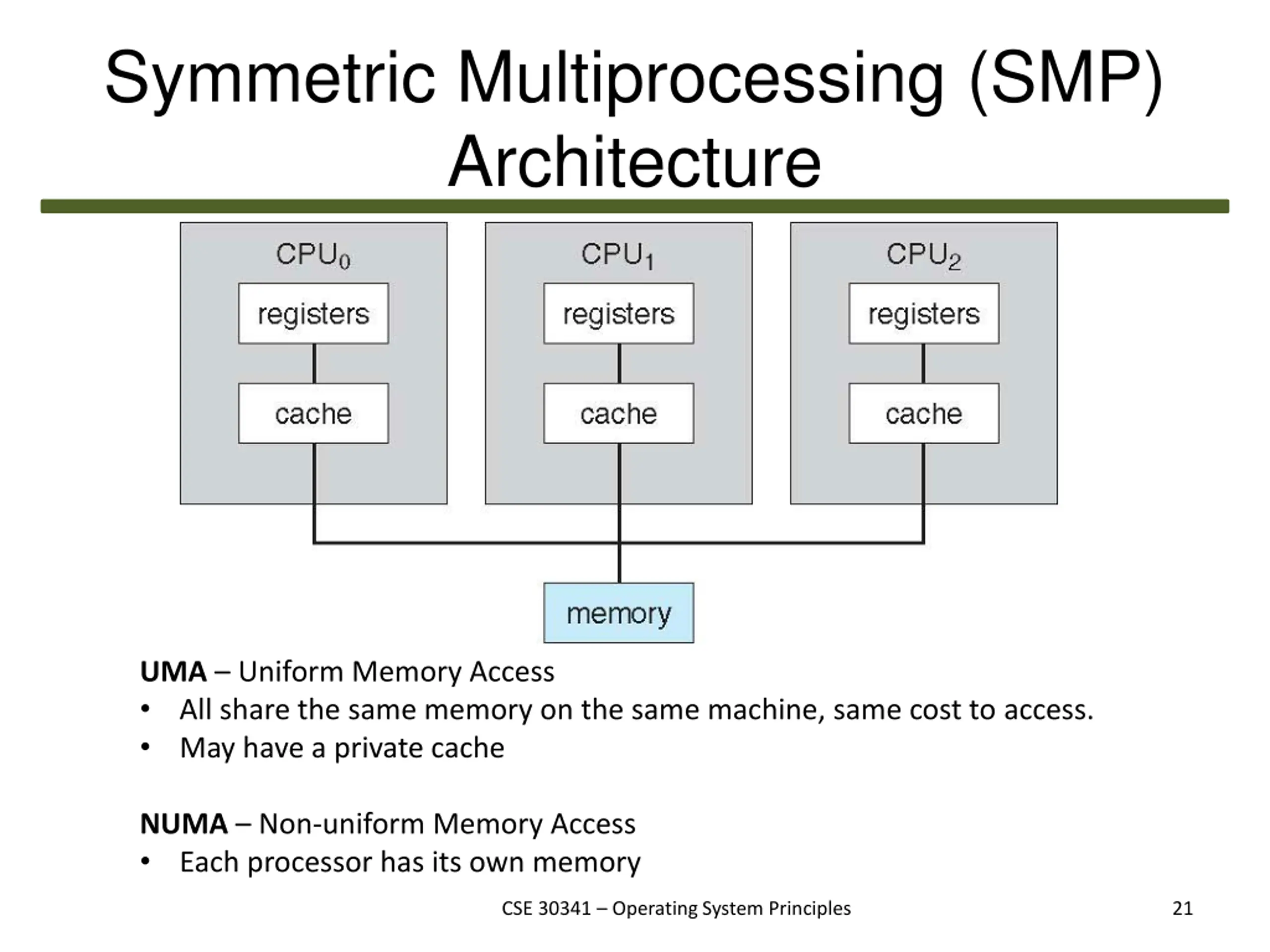 Symmetric Multiprocessing (SMP) Architecture UMA Uniform Memory Access All share the same memory on the same machine, same cost to access. May have a private cache NUMA Non-uniform Memory Access Each processor has its own memory CSE 30341 Operating System Principles 21