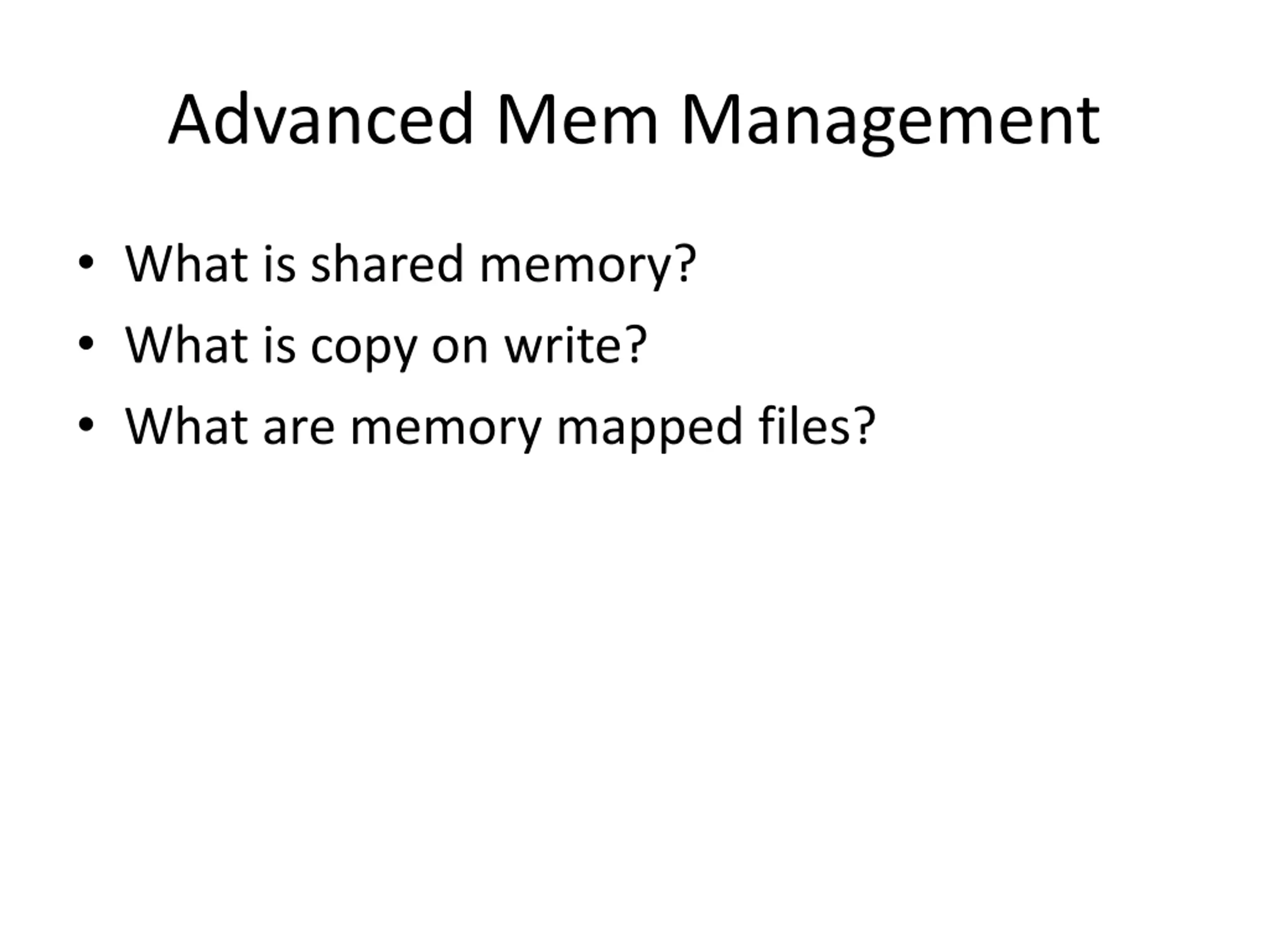 Advanced Mem Management What is shared memory? What is copy on write? What are memory mapped files?