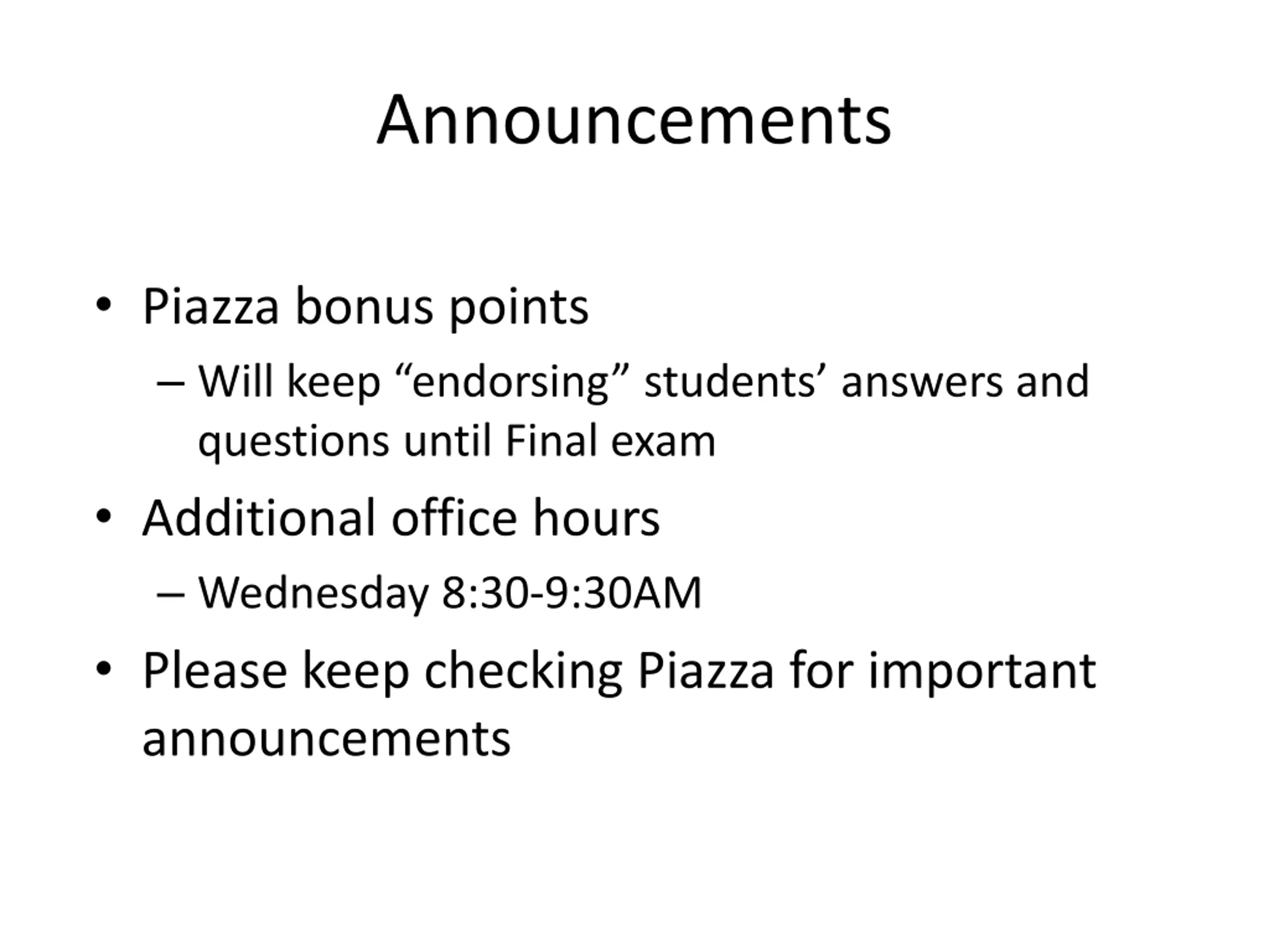 Announcements Piazza bonus points Will keep endorsing students answers and questions until Final exam Additional office hours Wednesday 8:30-9:30AM Please keep checking Piazza for important announcements