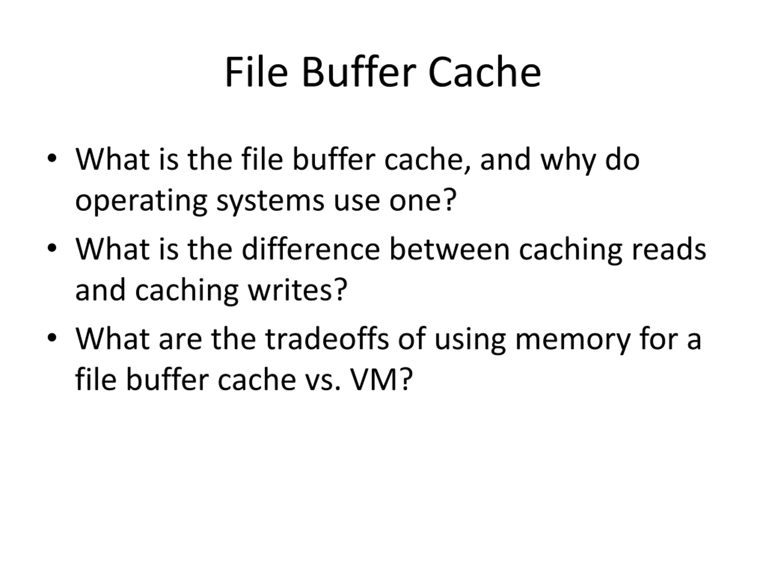 File Buffer Cache What is the file buffer cache, and why do operating systems use one? What is the difference between caching reads and caching writes? What are the tradeoffs of using memory for a file buffer cache vs. VM?
