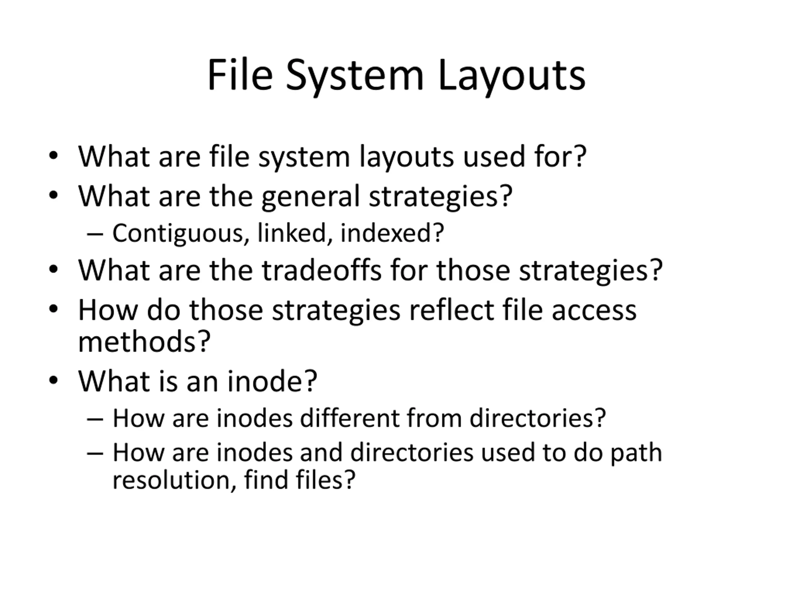 File System Layouts What are file system layouts used for? What are the general strategies? Contiguous, linked, indexed? What are the tradeoffs for those strategies? How do those strategies reflect file access methods? What is an inode? How are inodes different from directories? How are inodes and directories used to do path resolution, find files?