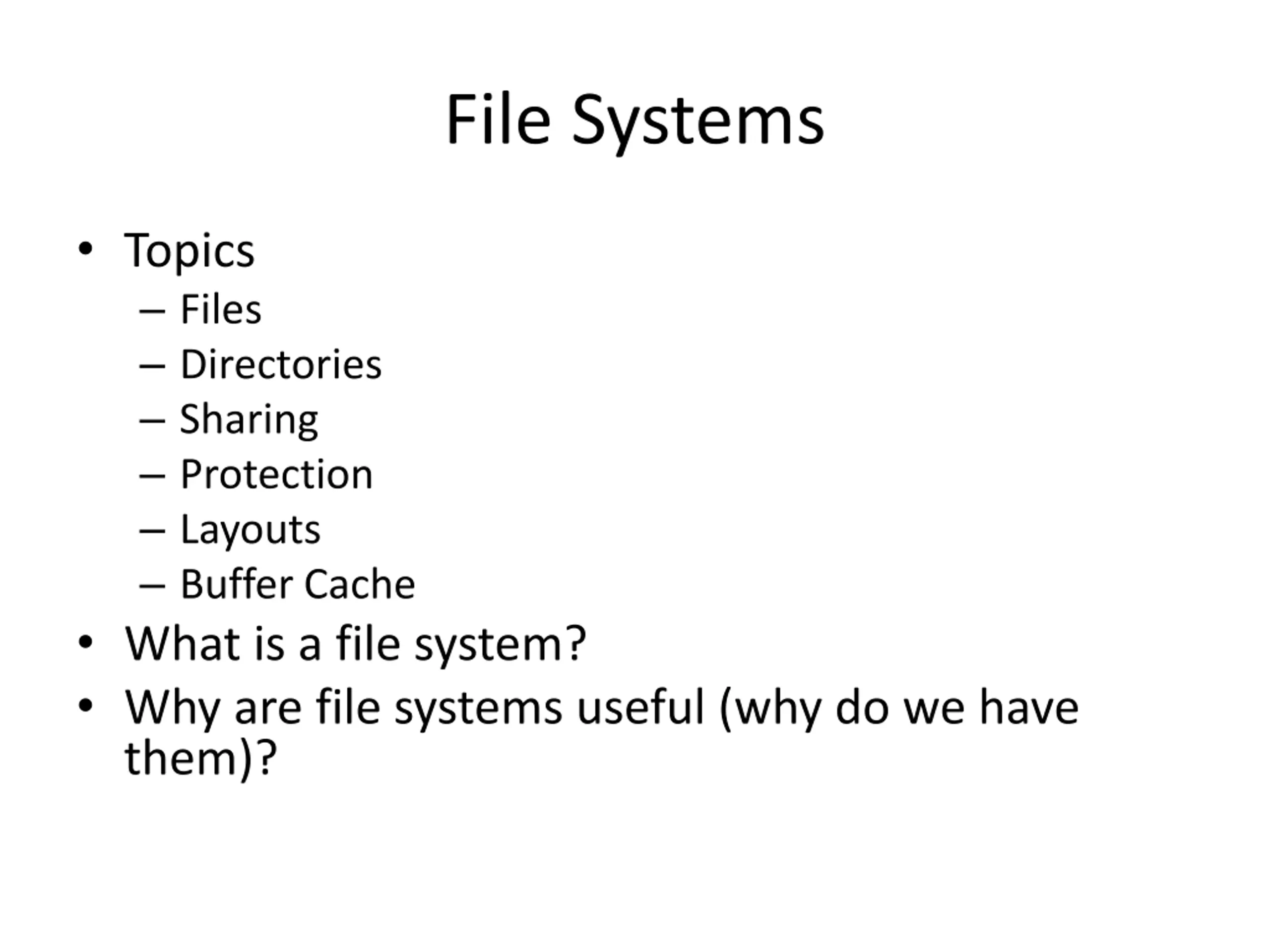 File Systems Topics Files Directories Sharing Protection Layouts Buffer Cache What is a file system? Why are file systems useful (why do we have them)?