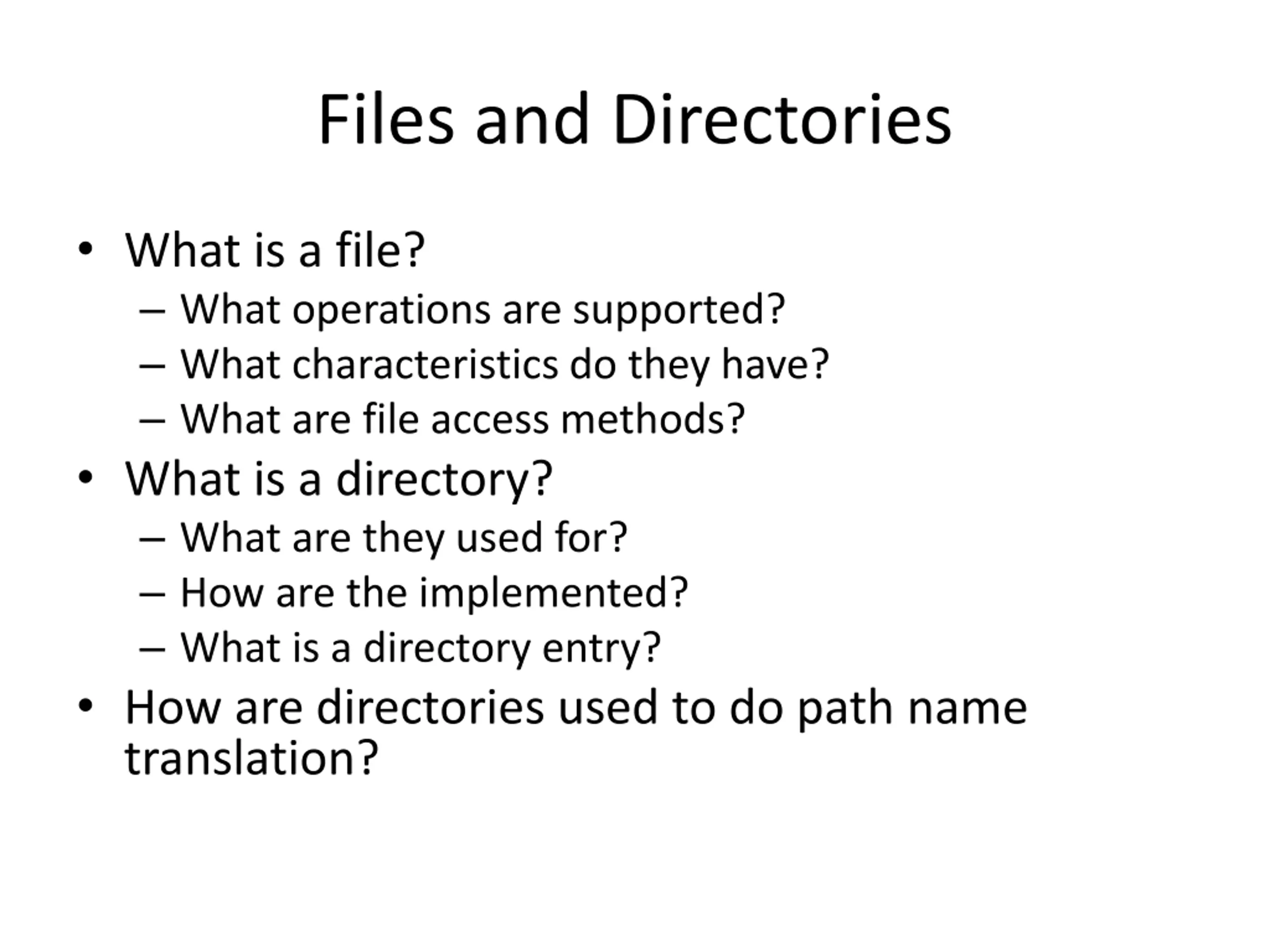 Files and Directories What is a file? What operations are supported? What characteristics do they have? What are file access methods? What is a directory? What are they used for? How are the implemented? What is a directory entry? How are directories used to do path name translation?