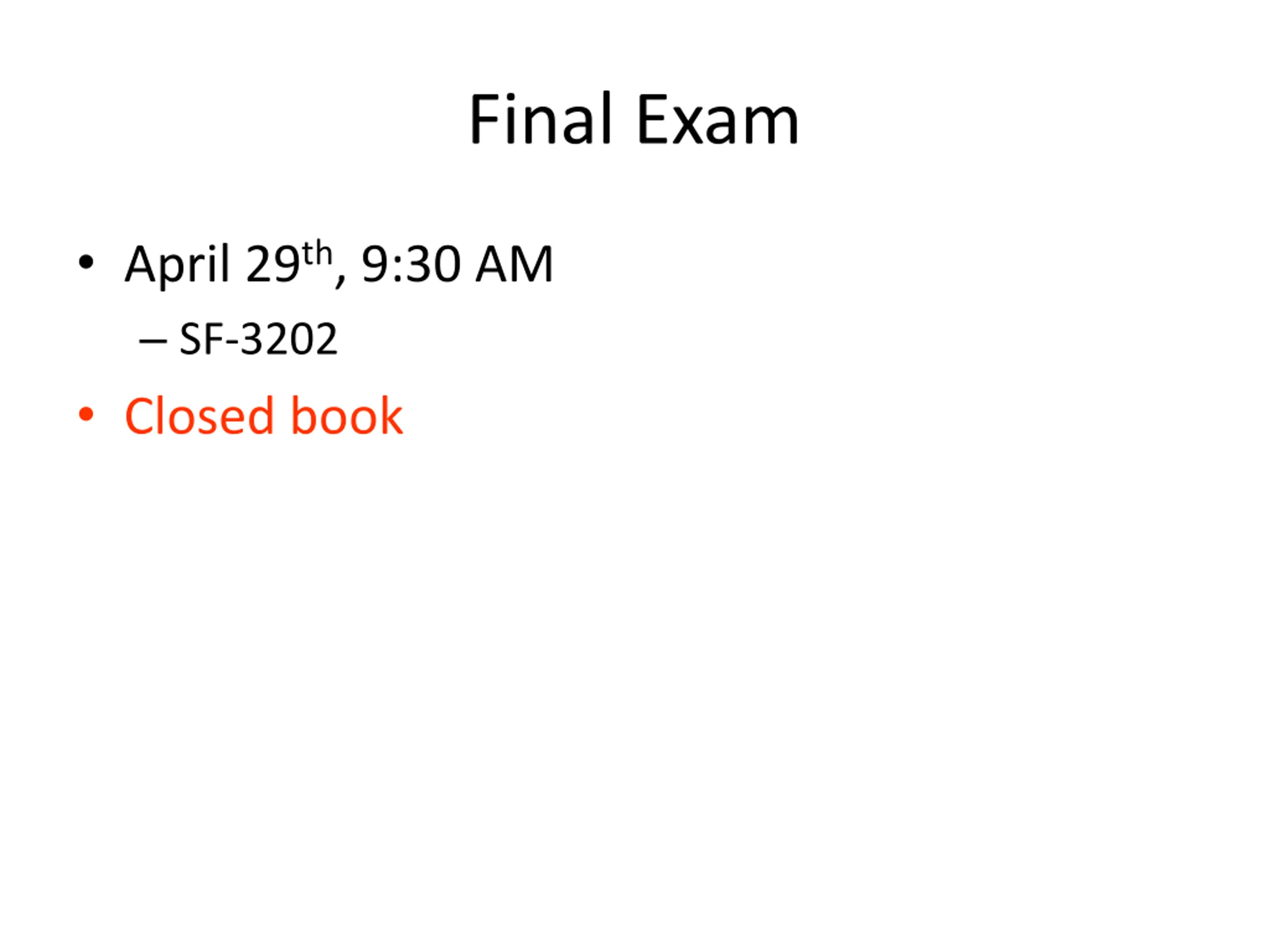 Final Exam April 29th, 9:30 AM SF-3202 Closed book