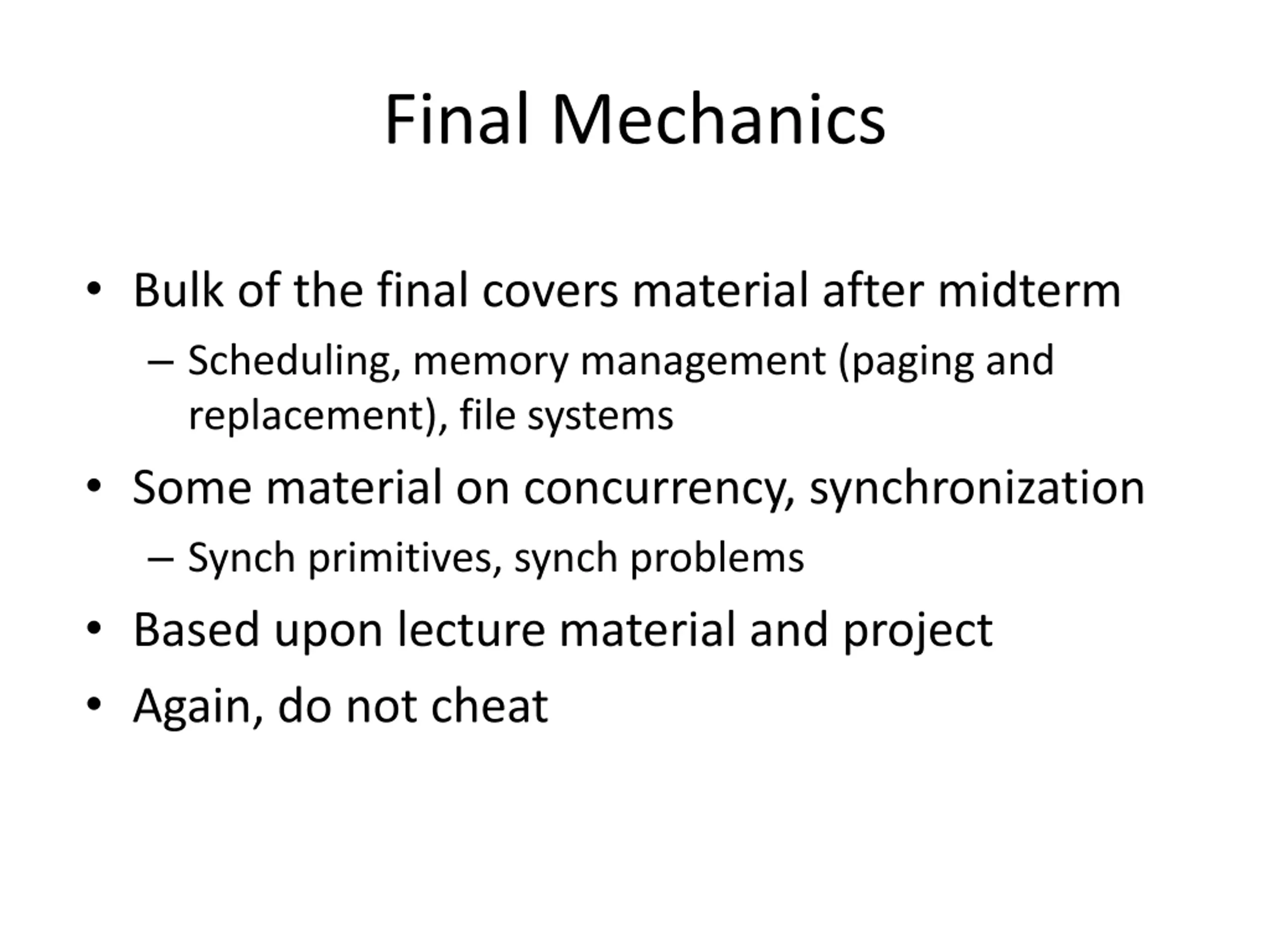 Final Mechanics Bulk of the final covers material after midterm Scheduling, memory management (paging and replacement), file systems Some material on concurrency, synchronization Synch primitives, synch problems Based upon lecture material and project Again, do not cheat