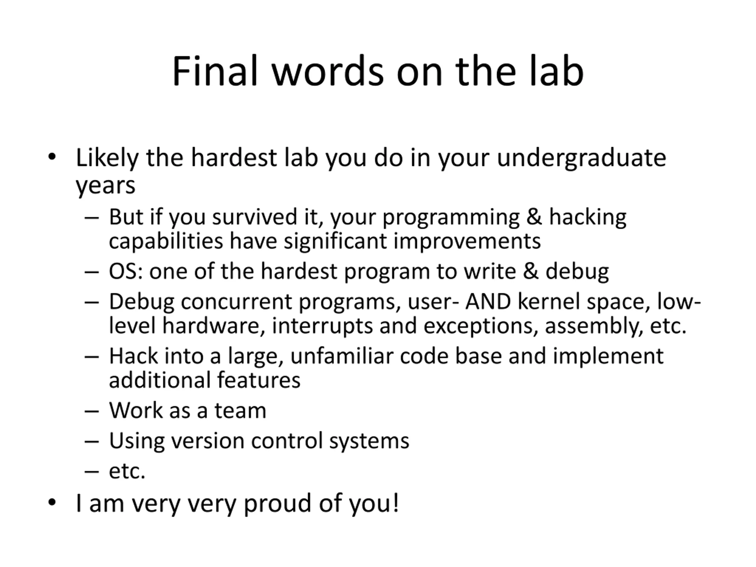 Final words on the lab Likely the hardest lab you do in your undergraduate years But if you survived it, your programming & hacking capabilities have significant improvements OS: one of the hardest program to write & debug Debug concurrent programs, user- AND kernel space, low- level hardware, interrupts and exceptions, assembly, etc. Hack into a large, unfamiliar code base and implement additional features Work as a team Using version control systems etc. I am very very proud of you!