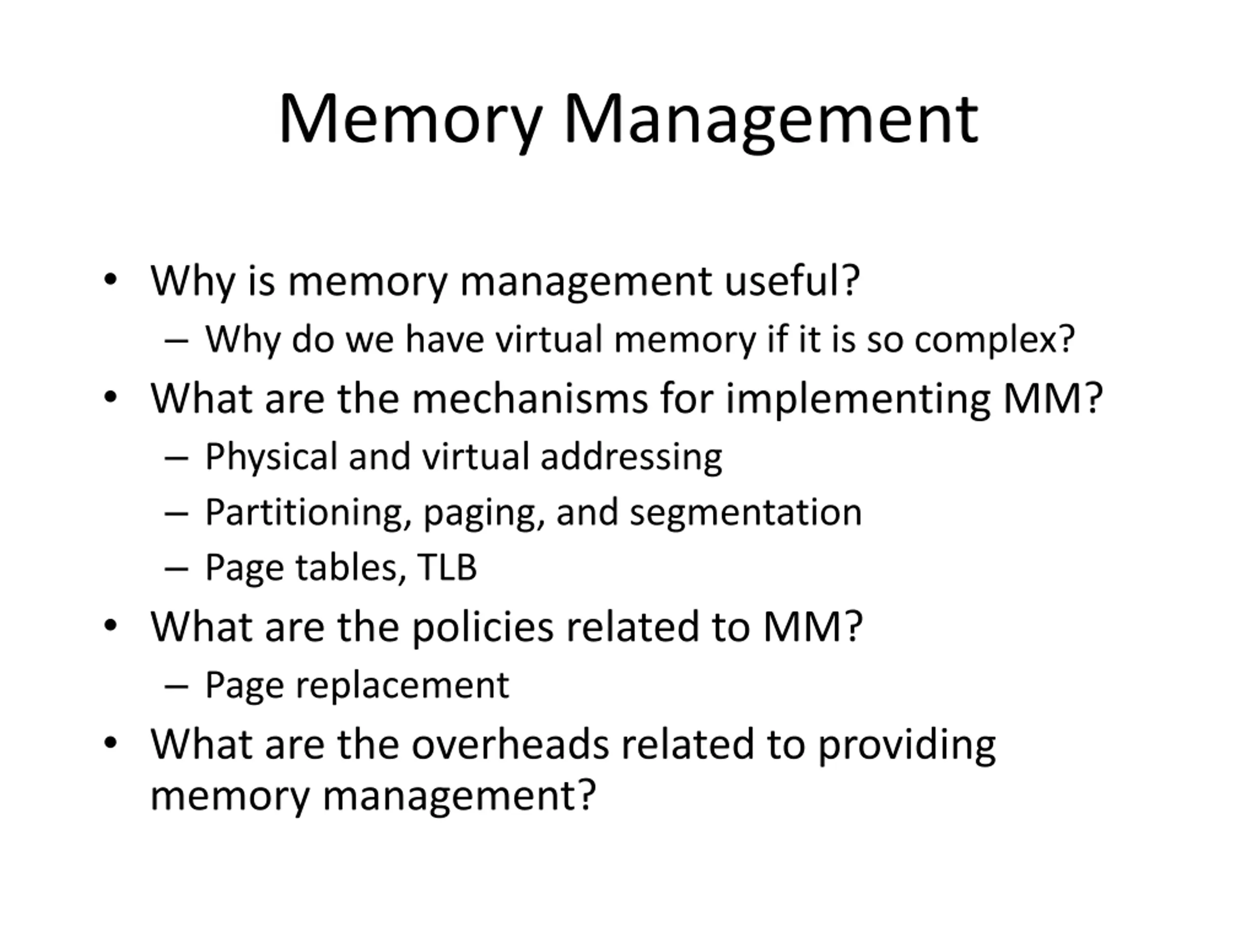 Memory Management Why is memory management useful? Why do we have virtual memory if it is so complex? What are the mechanisms for implementing MM? Physical and virtual addressing Partitioning, paging, and segmentation Page tables, TLB What are the policies related to MM? Page replacement What are the overheads related to providing memory management?