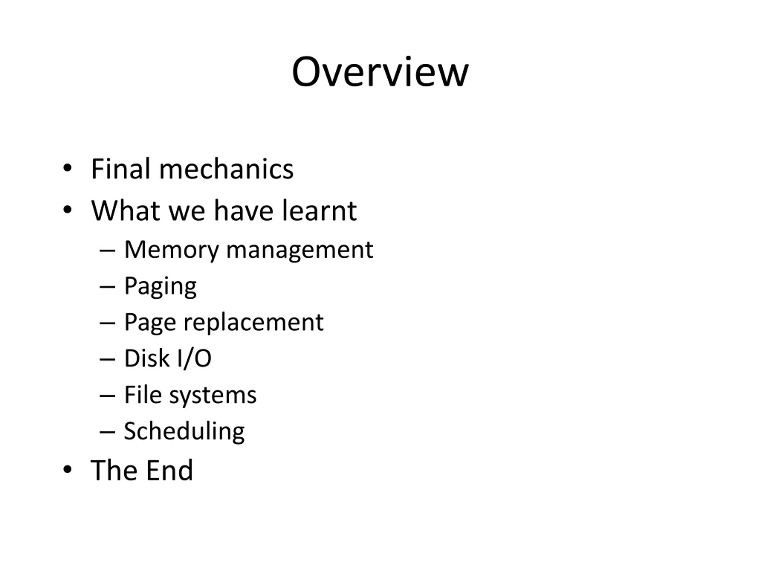Overview Final mechanics What we have learnt Memory management Paging Page replacement Disk I/O File systems Scheduling The End