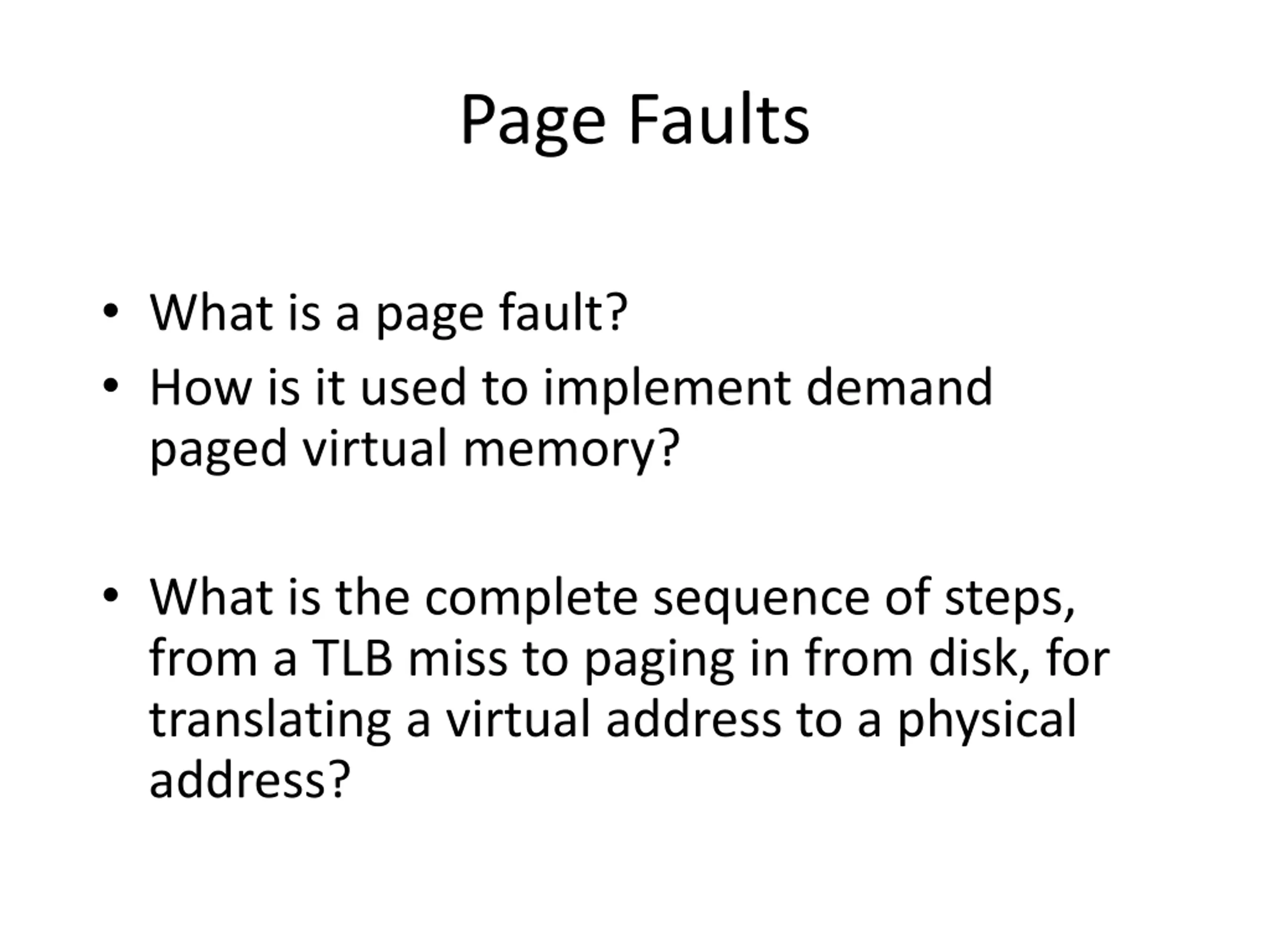 Page Faults What is a page fault? How is it used to implement demand paged virtual memory? What is the complete sequence of steps, from a TLB miss to paging in from disk, for translating a virtual address to a physical address?