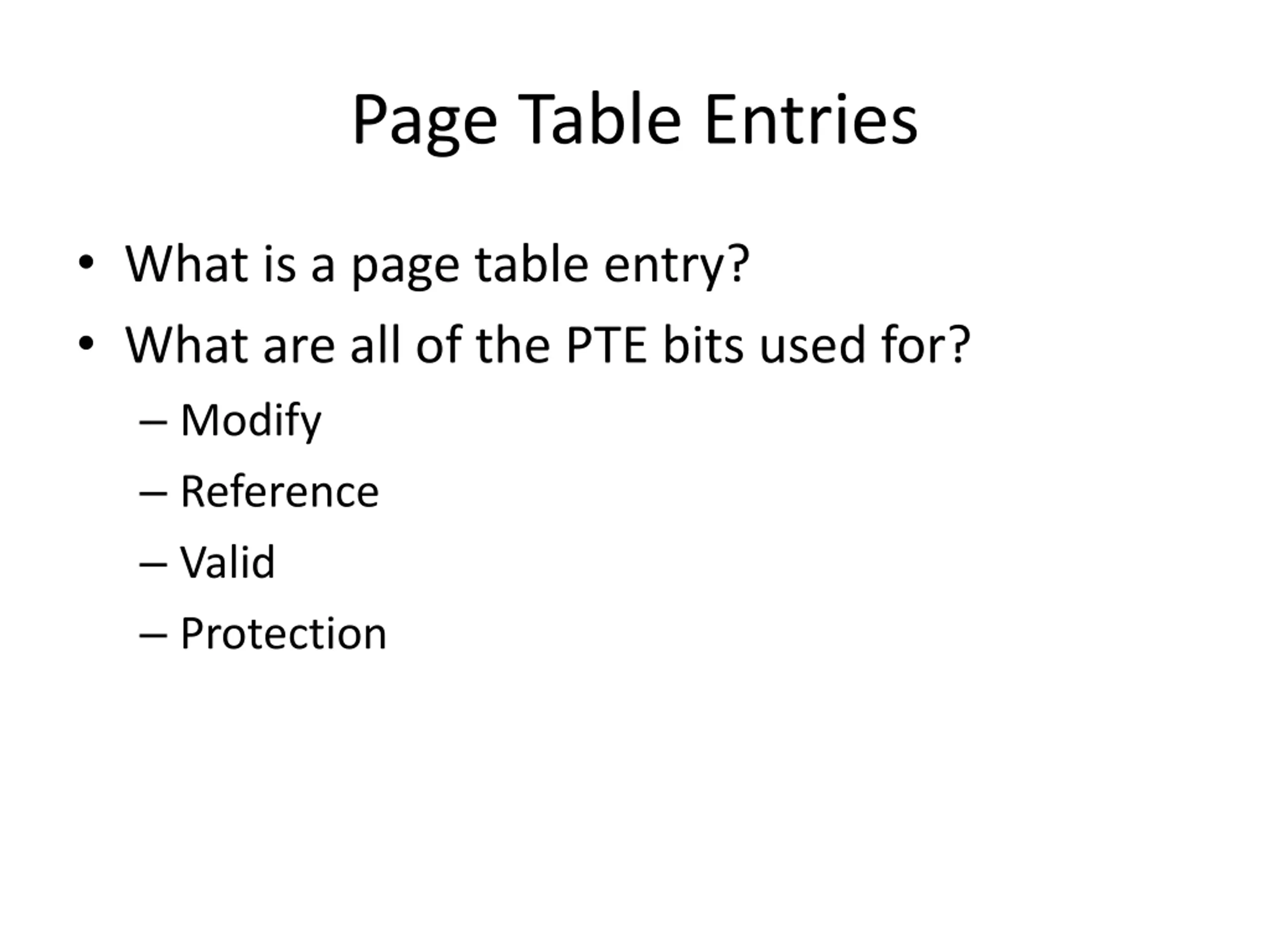Page Table Entries What is a page table entry? What are all of the PTE bits used for? Modify Reference Valid Protection