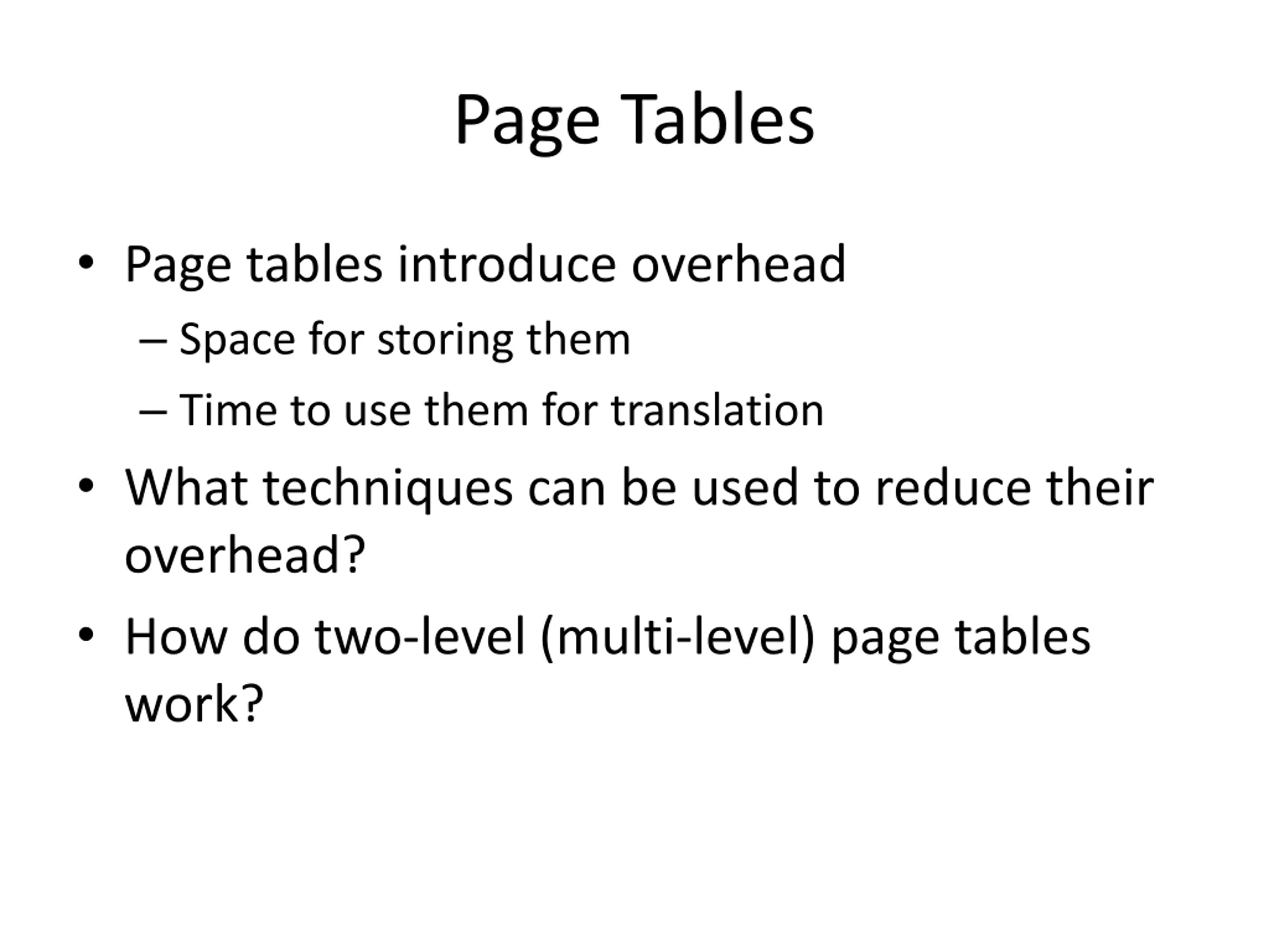 Page Tables Page tables introduce overhead Space for storing them Time to use them for translation What techniques can be used to reduce their overhead? How do two-level (multi-level) page tables work?