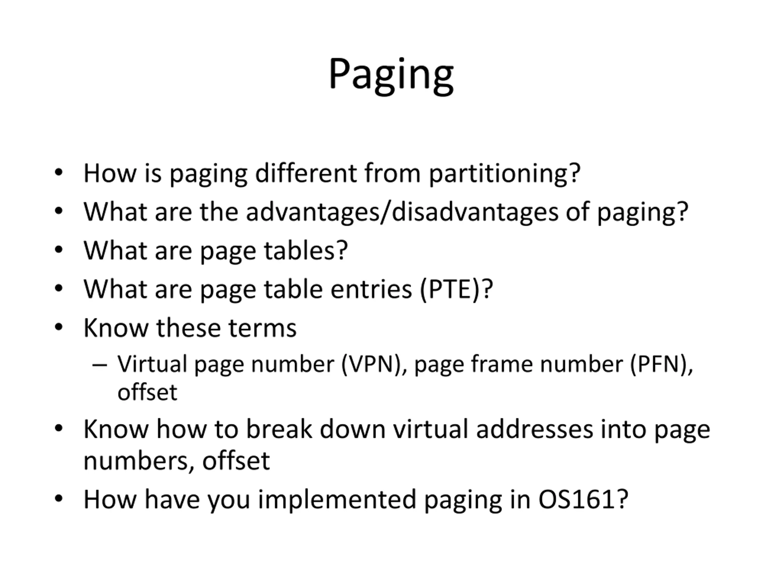 Paging How is paging different from partitioning? What are the advantages/disadvantages of paging? What are page tables? What are page table entries (PTE)? Know these terms Virtual page number (VPN), page frame number (PFN), offset Know how to break down virtual addresses into page numbers, offset How have you implemented paging in OS161?