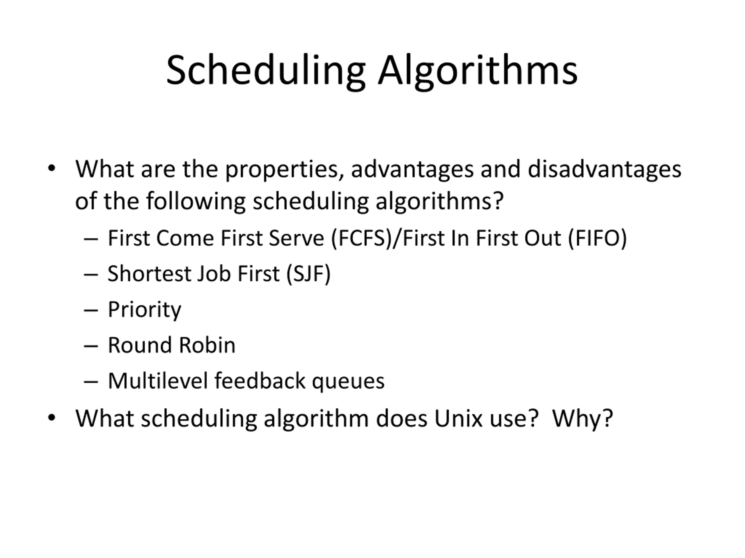 Scheduling Algorithms What are the properties, advantages and disadvantages of the following scheduling algorithms? First Come First Serve (FCFS)/First In First Out (FIFO) Shortest Job First (SJF) Priority Round Robin Multilevel feedback queues What scheduling algorithm does Unix use? Why?