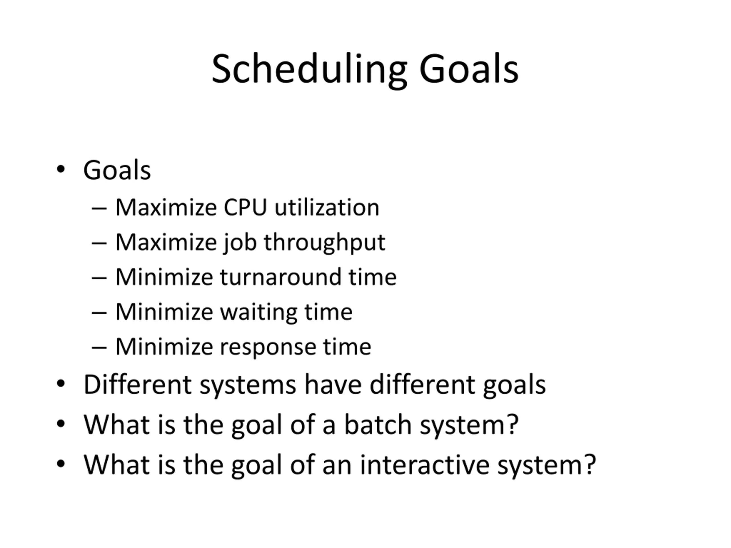 Scheduling Goals Goals Maximize CPU utilization Maximize job throughput Minimize turnaround time Minimize waiting time Minimize response time Different systems have different goals What is the goal of a batch system? What is the goal of an interactive system?