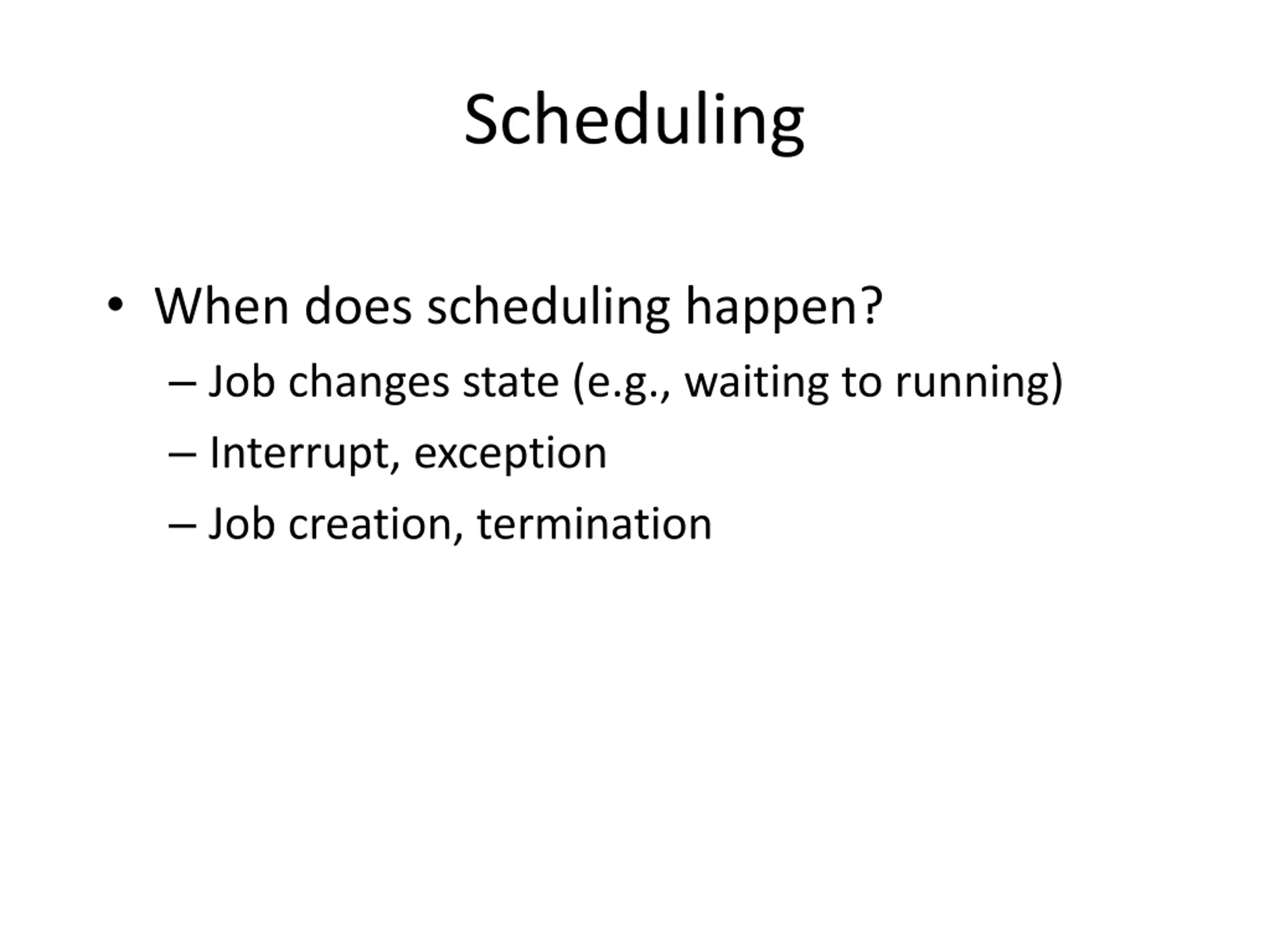Scheduling When does scheduling happen? Job changes state (e.g., waiting to running) Interrupt, exception Job creation, termination
