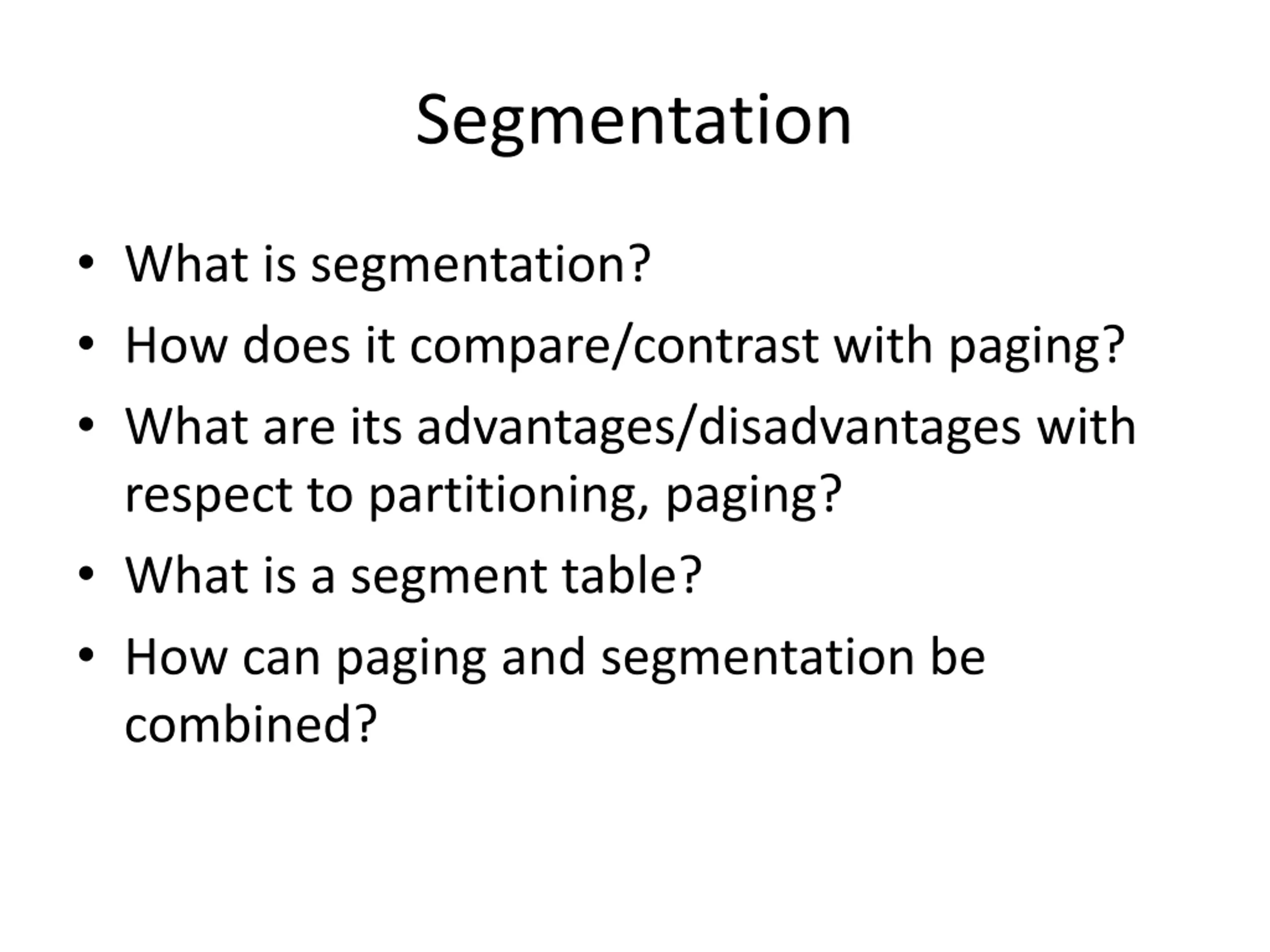 Segmentation What is segmentation? How does it compare/contrast with paging? What are its advantages/disadvantages with respect to partitioning, paging? What is a segment table? How can paging and segmentation be combined?