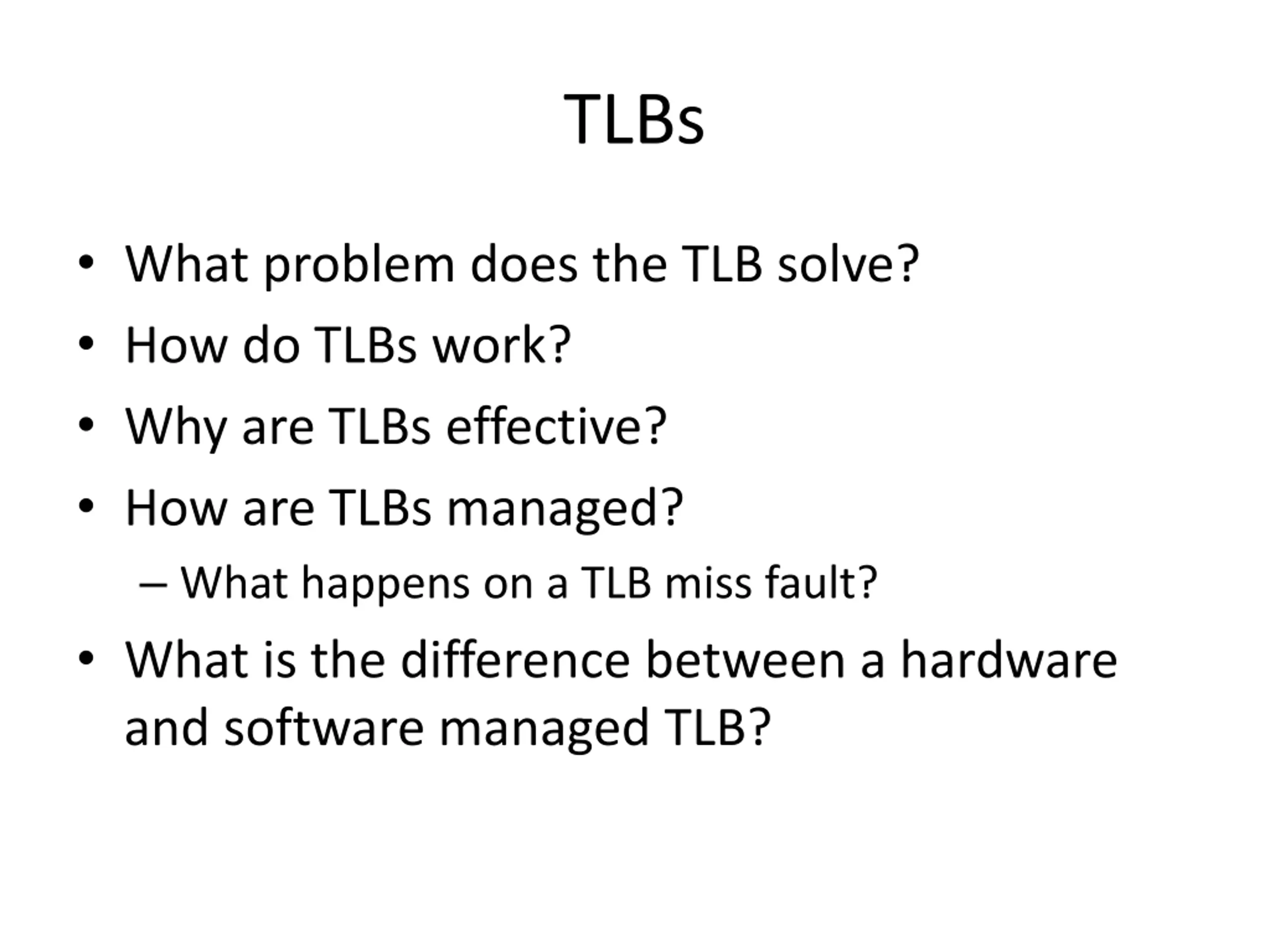 TLBs What problem does the TLB solve? How do TLBs work? Why are TLBs effective? How are TLBs managed? What happens on a TLB miss fault? What is the difference between a hardware and software managed TLB?