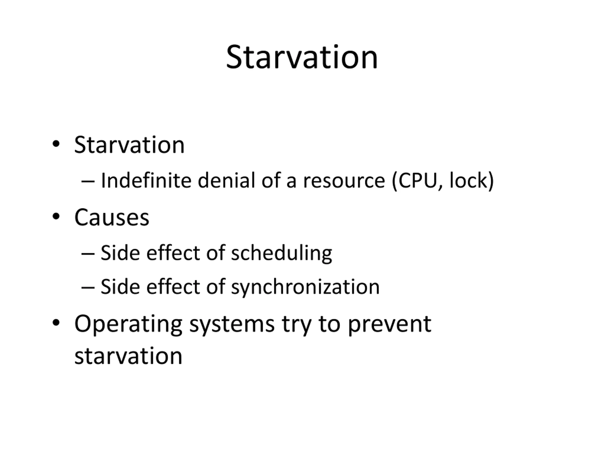 Starvation Starvation Indefinite denial of a resource (CPU, lock) Causes Side effect of scheduling Side effect of synchronization Operating systems try to prevent starvation