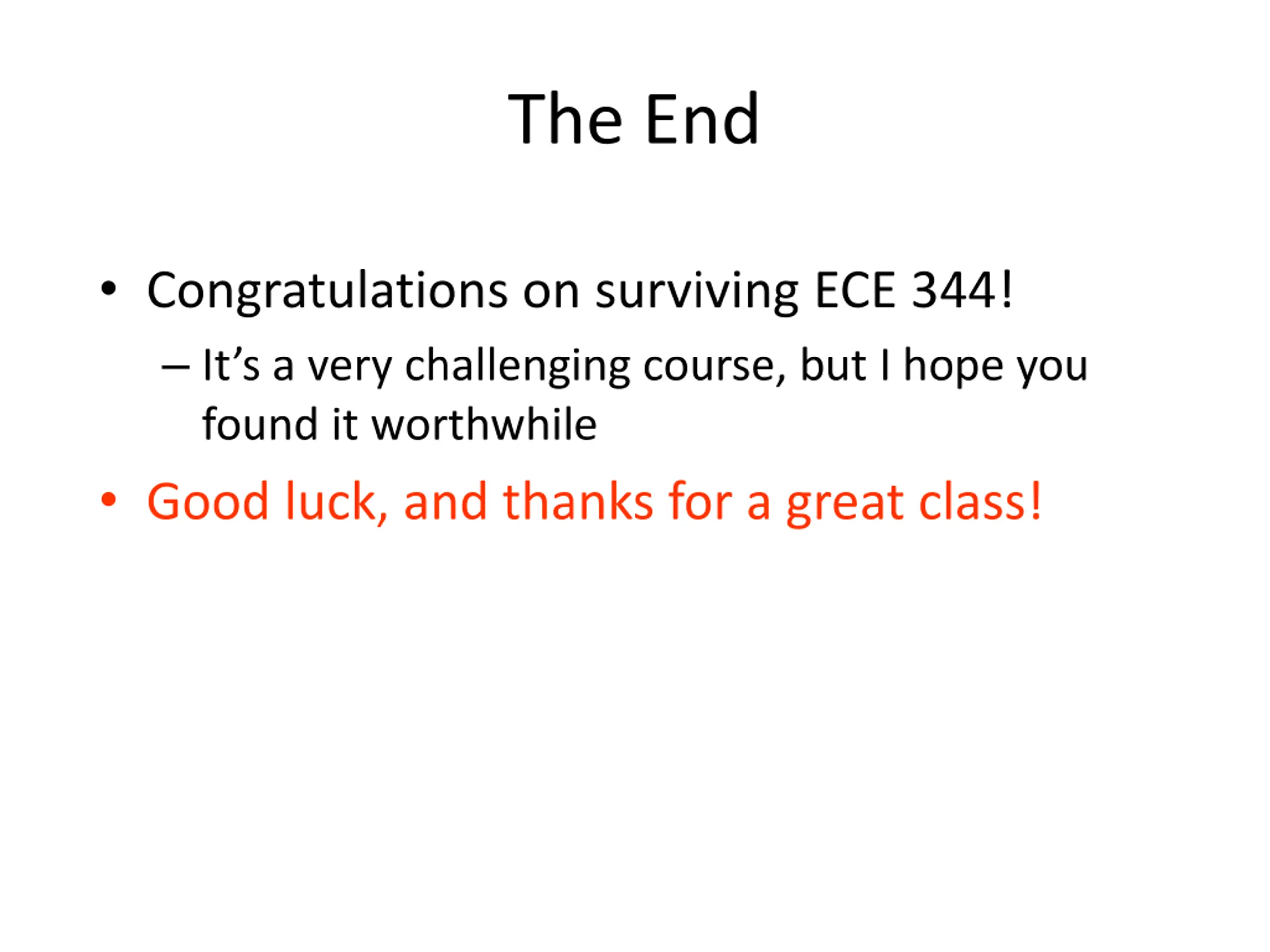 The End Congratulations on surviving ECE 344! It s a very challenging course, but I hope you found it worthwhile Good luck, and thanks for a great class!
