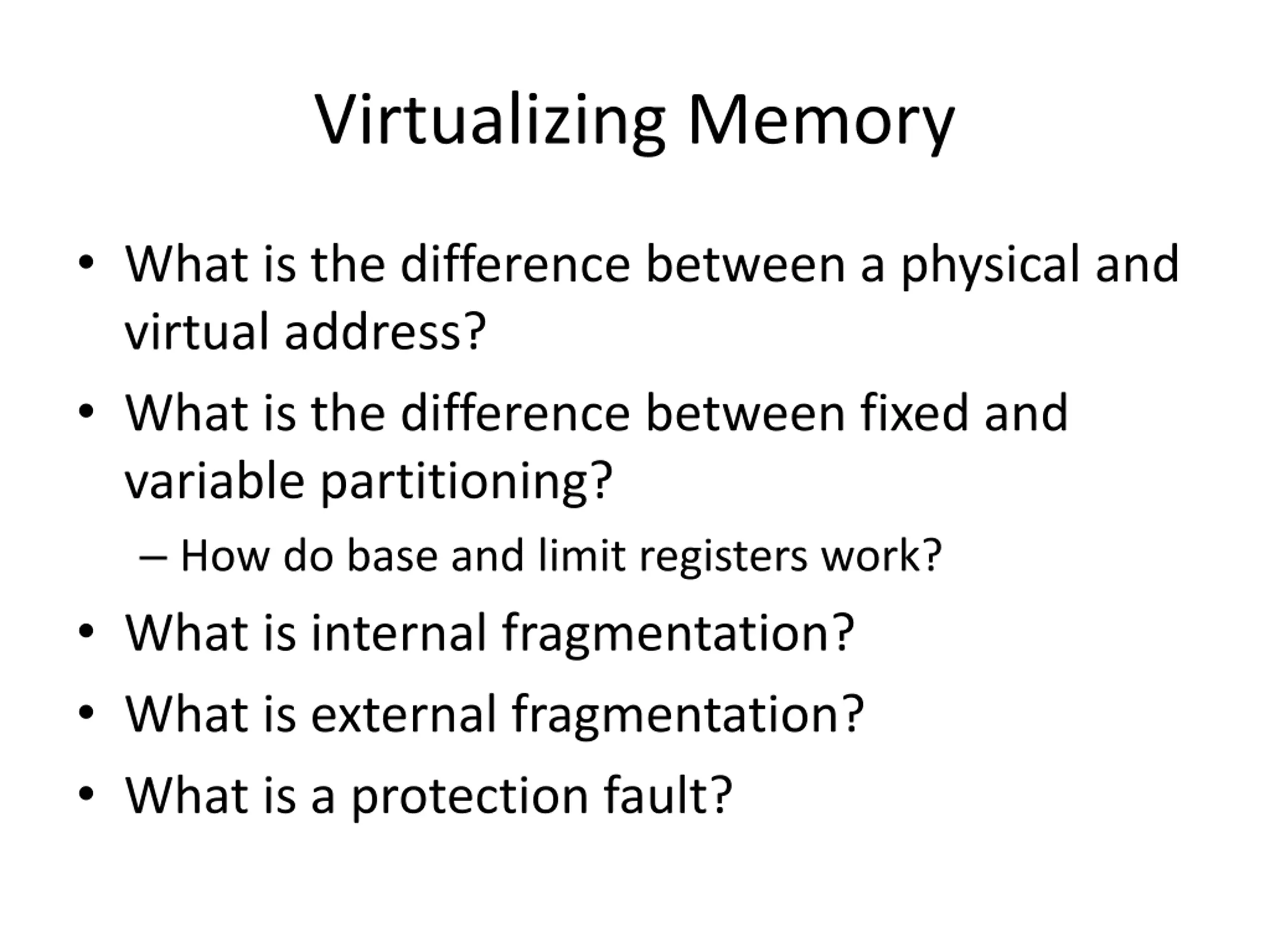 Virtualizing Memory What is the difference between a physical and virtual address? What is the difference between fixed and variable partitioning? How do base and limit registers work? What is internal fragmentation? What is external fragmentation? What is a protection fault?