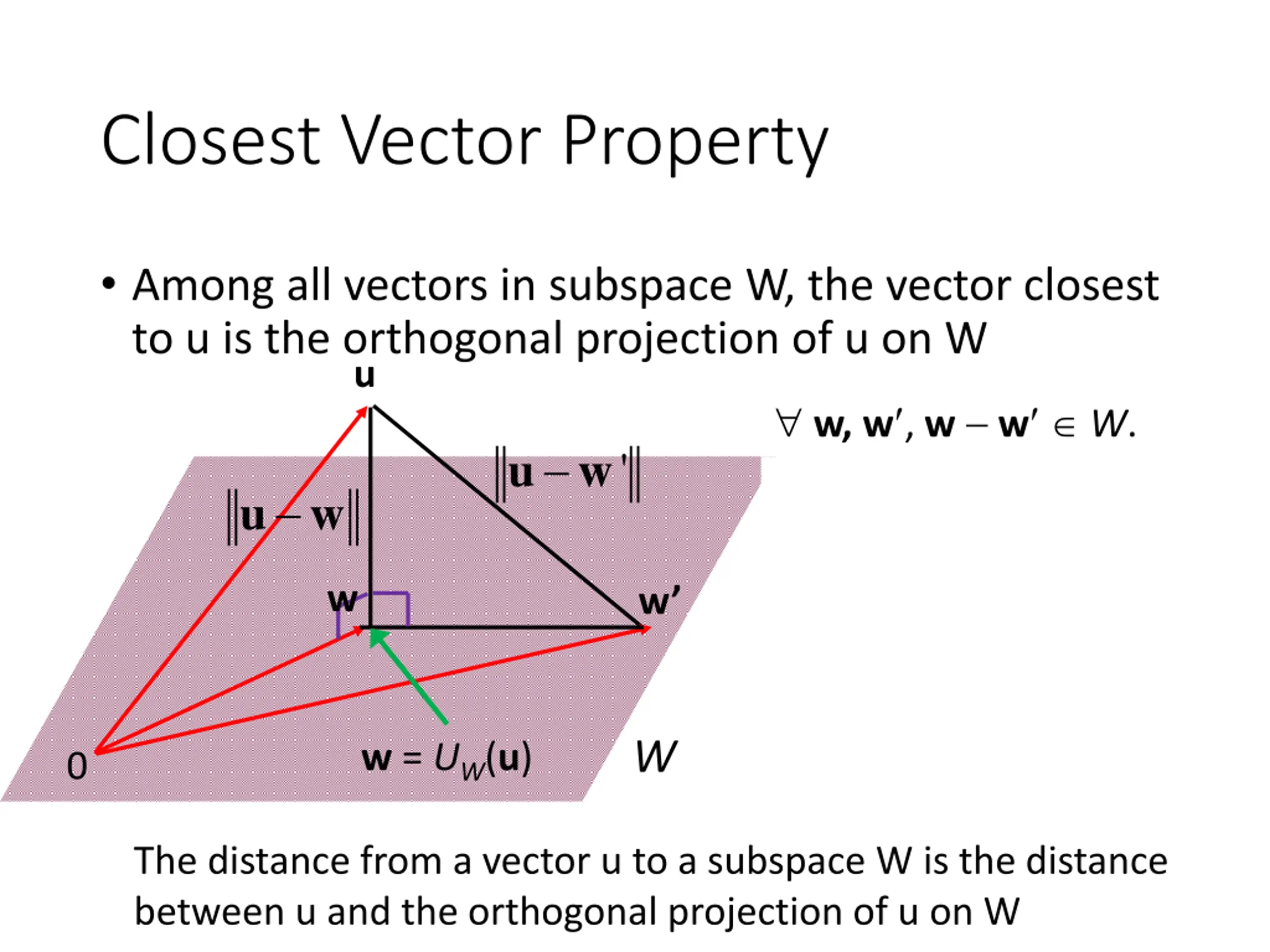Closest Vector Property Among all vectors in subspace W, the vector closest to u is the orthogonal projection of u on W u w, w , w w W. u w ' (u w) (w w ) = 0. u w u w 2 w w = (u w) + (w w ) 2 = u w 2+ w w 2 W w = UW(u) 0 > u w 2 The distance from a vector u to a subspace W is the distance between u and the orthogonal projection of u on W
